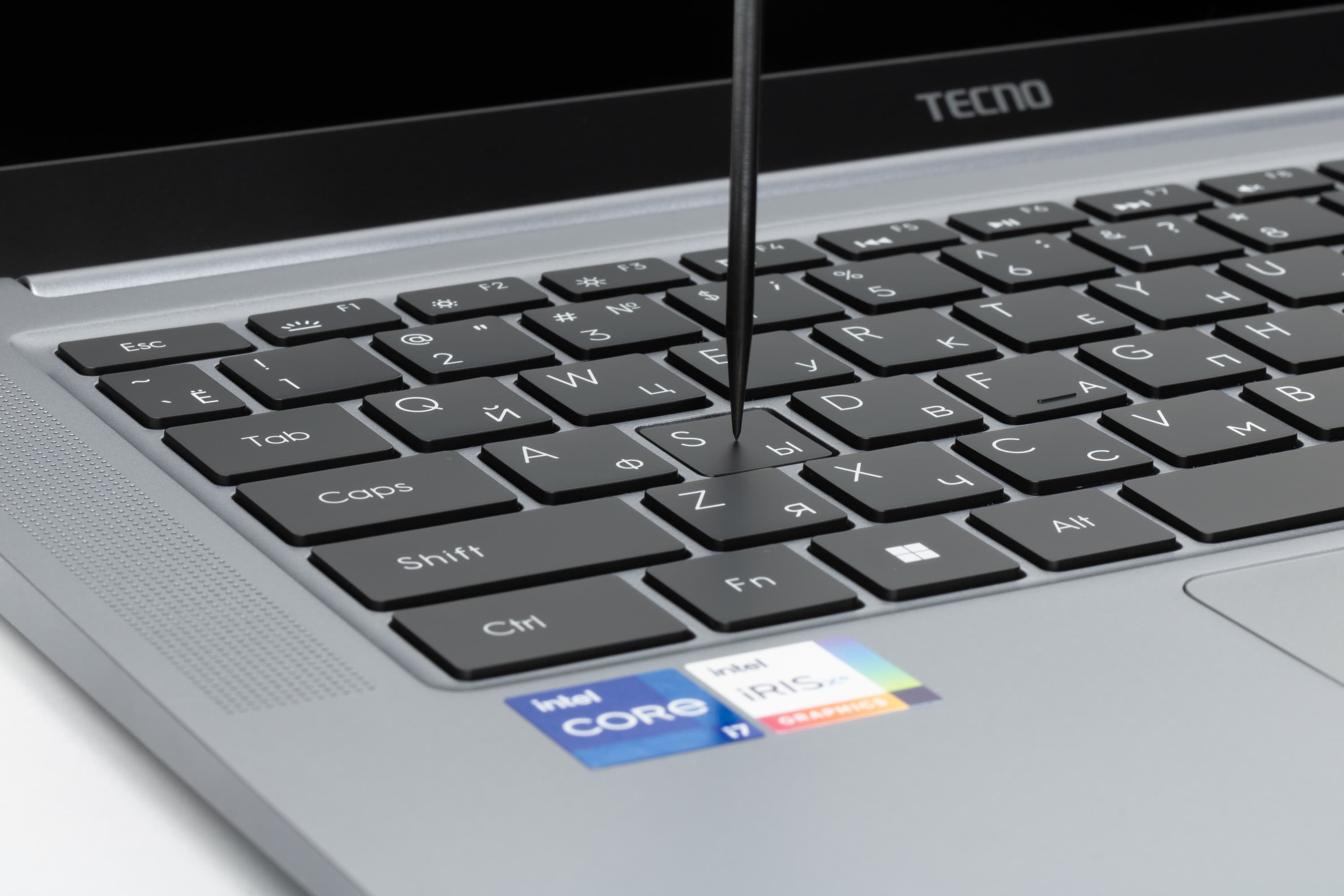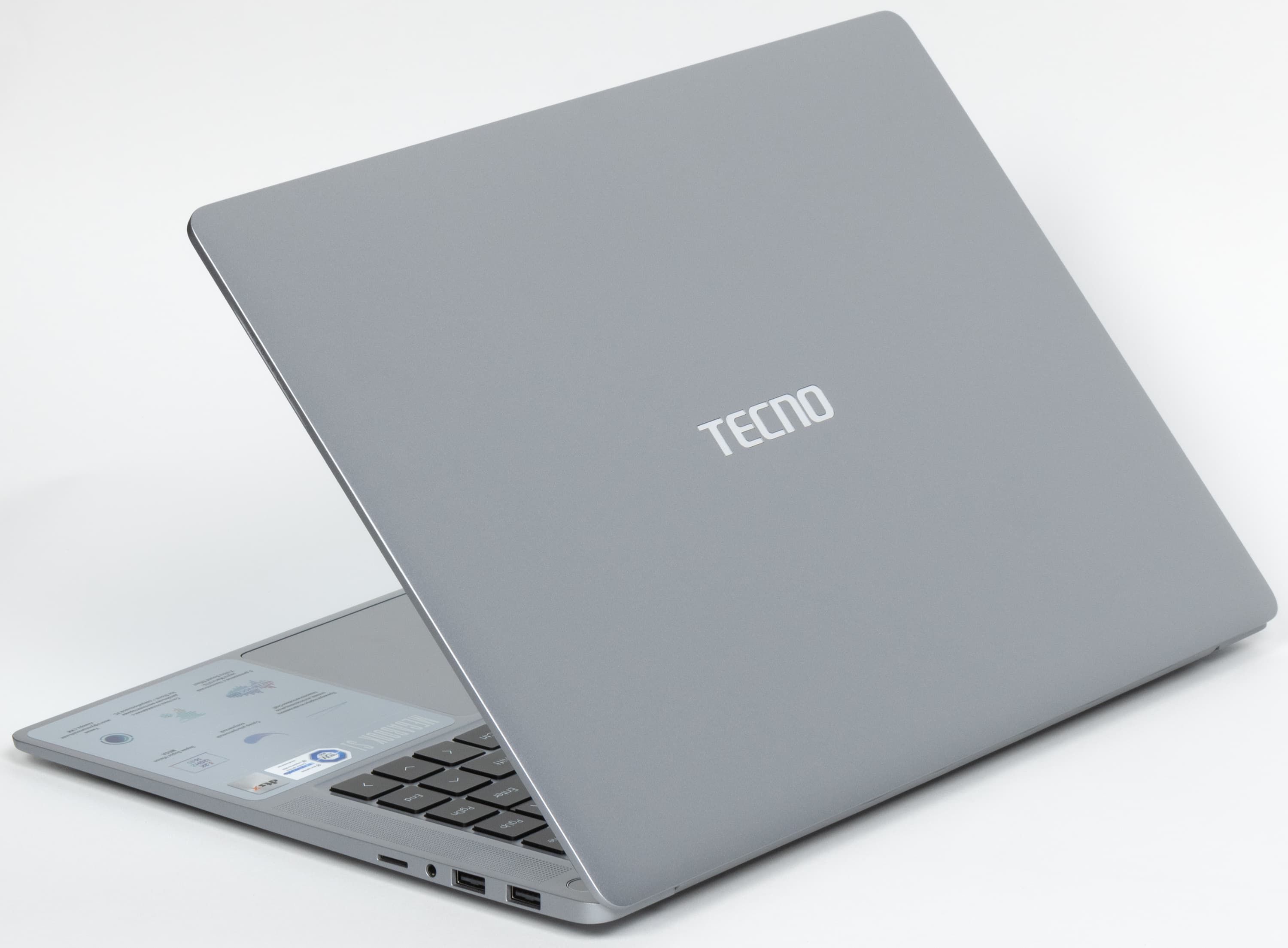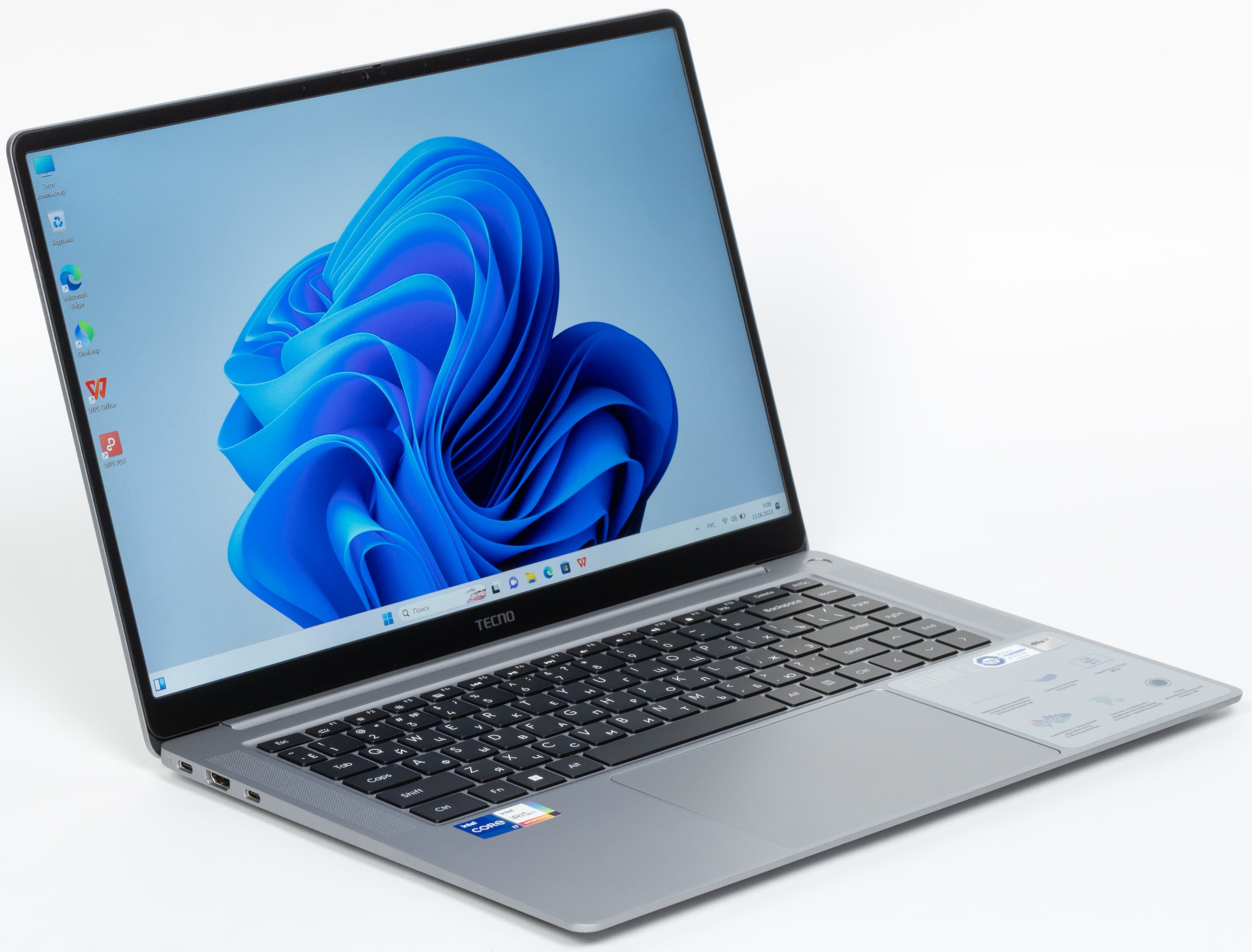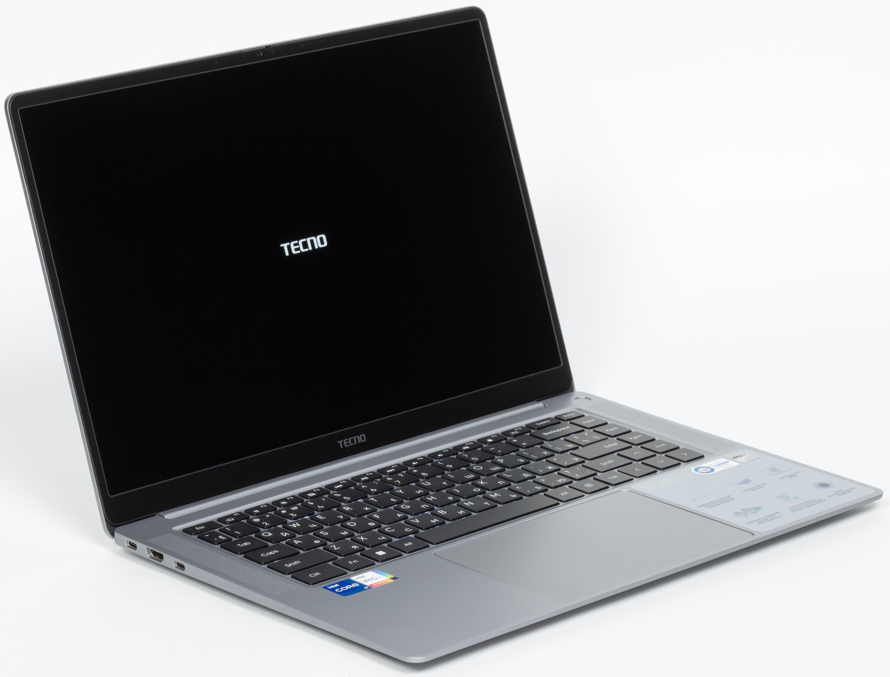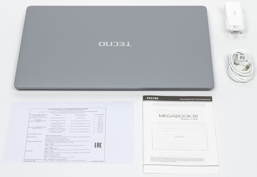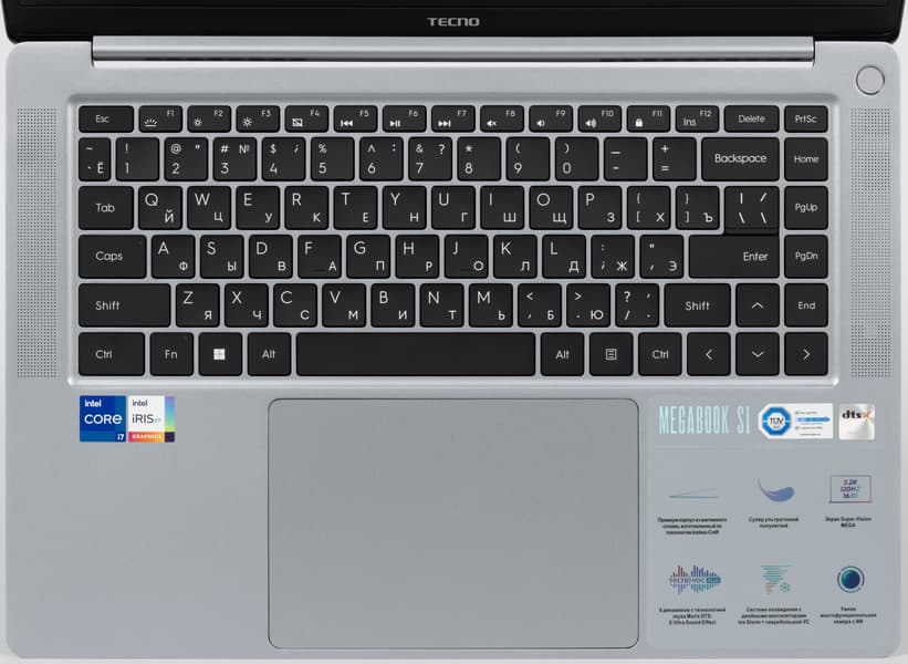 В аппаратной оснастке более всего впечатляют не процессор (предыдущего поколения, маломощный, но энергоэкономичный), не объем оперативной памяти и емкость системного накопителя, а экран со сверхвысоким разрешением. Производителем заявлена его яркость на максимуме 450 нит (по нашим измерениям — 388 кд/м², но это тоже очень хорошо). Акустика представлена тремя парами динамиков. Порты HDMI плюс USB Type-C с поддержкой DisplayPort дают возможность подключить к машине три внешних монитора одновременно. Для деловых людей несомненную полезность представляют веб-камера 2 Мп, микрофоны с шумоподавлением, трехполосная акустическая система (6 динамиков), картовод для microSD и дактилоскопический сканер в кнопке включения питания, позволяющий идентифицировать пользователя при «холодном» старте без необходимости дополнительного ввода пароля. В отличие от некоторых конкурентов, продаваемых сегодня в России, Tecno Megabook S1 поставляется с предустановленной Windows 11 Home, поэтому ноутбук можно немедленно испытать на пригодность в магазине или при интернет-доставке.