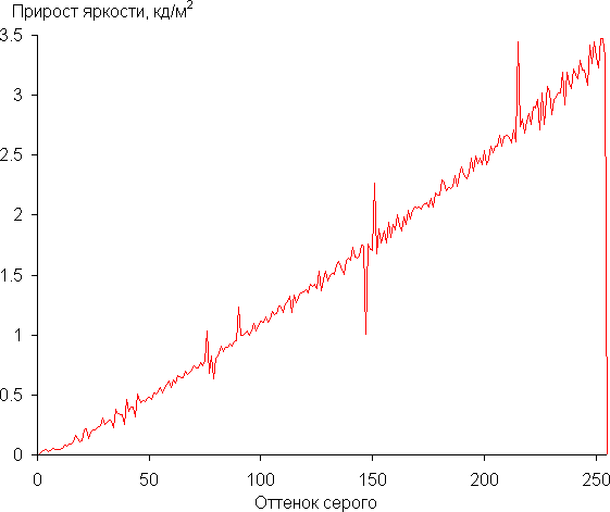 Далее мы измерили яркость 256 оттенков серого (от 0, 0, 0 до 255, 255, 255). График ниже показывает прирост (не абсолютное значение!) яркости между соседними полутонами: