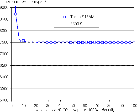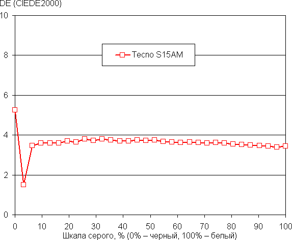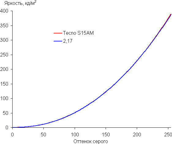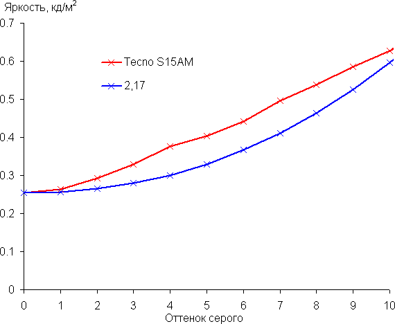 Рост прироста яркости на шкале серого в основном равномерный, и каждый следующий оттенок ярче предыдущего, за исключением одного самого светлого оттенка серого, который по яркости от белого не отличается. Впрочем, общей картины это не портит. В самой темной области визуально различаются все оттенки: