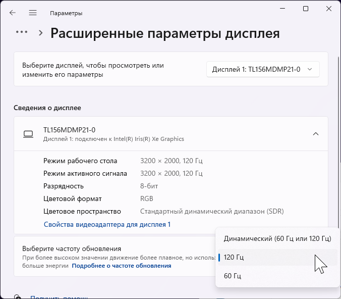 В настройках экрана доступны несколько частот обновления: