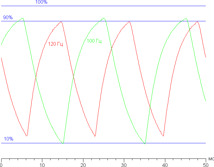 Видно, что при 120 Гц максимальная яркость белого кадра ниже уровня 90% от белого, а минимальная яркость черного кадра выше 10% от белого, то есть амплитуда изменения яркости меньше 80% от уровня белого. Согласно этому формальному критерию, скорости матрицы недостаточно для вывода изображения с кадровой частотой 120 Гц. А вот в случае 100 Гц — достаточно, так как амплитуда изменения яркости чуть больше 80%.