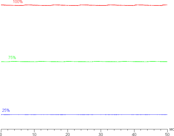 На любом уровне яркости значимая модуляция подсветки отсутствует, поэтому нет и никакого мерцания экрана (нет ШИМ). В доказательство приведем графики зависимости яркости (вертикальная ось) от времени (горизонтальная ось) при различных значениях настройки яркости: