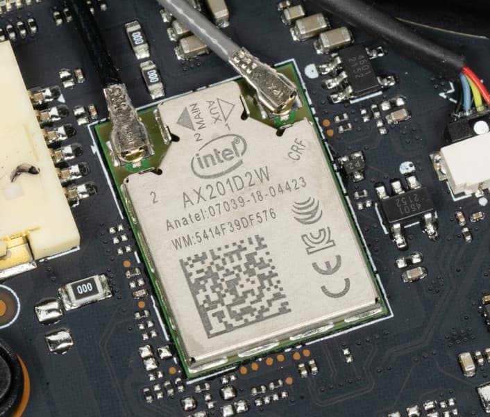 Под правым вентилятором установлен двухдиапазонный (2,4/5 ГГц) адаптер беспроводной связи Wi-Fi 6E (AX201D2W, кодовое наименование Harrison Peak), поддерживающий одновременный прием и передачу сигнала с использованием двух антенн при множественных подключениях (2×2 MIMO). Он же обеспечивает связь по Bluetooth. Заметим, что этой модели недавно исполнилось 4 года. С тех пор вышли новые устройства Intel с поддержкой гигабитного подключения по Wi-Fi 6E — AX210 в 2020 г. и AX211 в 2021 г. (этой осенью будут анонсированы 5-гигабитные BE200 и BE202), но производитель, видимо, решил сэкономить. А пользователи лишились возможности последующей аппаратной модернизации Wi-Fi из-за распайки адаптера на плате.