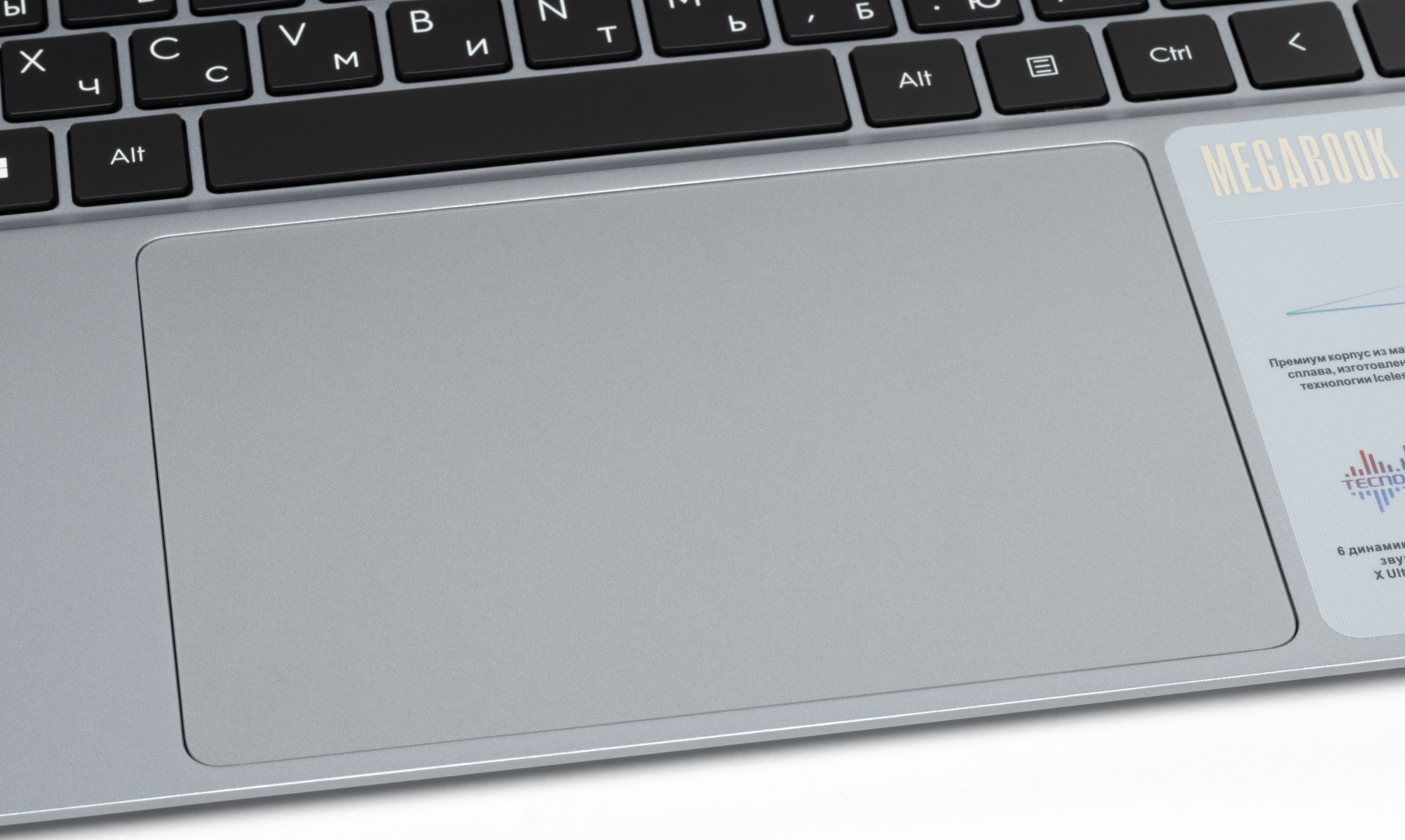 Перед клавиатурой точно по центру лицевой панели помещается увеличенный по площади чуть утопленный кликпад размером 143×100 мм без выделенных клавиш. Дальняя часть сенсорной площадки на нажатия реагирует неуверенно; их лучше совершать в ближних ⅔, где четкость срабатывания хорошая. С жестами, подразумевающими касание поверхности, никаких проблем не возникает.