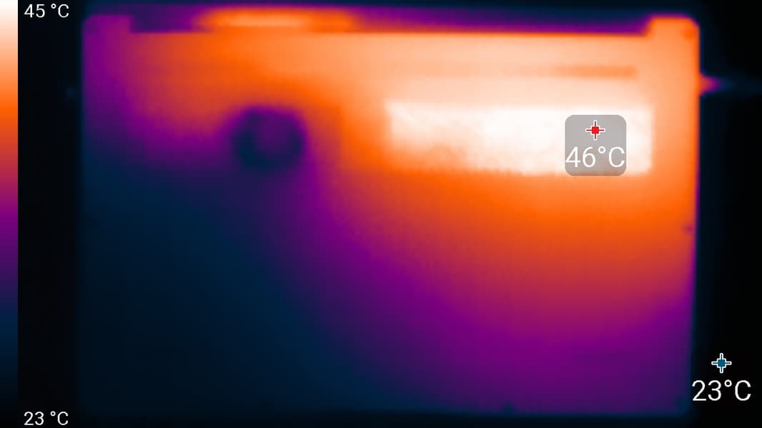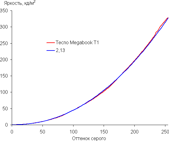 В ноутбуке используется 15,6-дюймовая IPS-матрица с разрешением 1920×1080 пикселей (отчет edid-decode). Ее внешняя поверхность черная, жесткая, полуматовая (правда, зеркальность хорошо выражена). Какие-либо специальные антибликовые покрытия и фильтры отсутствуют, нет и воздушного промежутка. При питании от сети или от батареи и при ручном управлении яркостью (автоматической подстройки по датчику освещенности нет) ее максимальное значение составило 328 кд/м² (в центре экрана на белом фоне). Если избегать прямого солнечного света, то такое значение позволяет как-то использовать ноутбук на улице даже летним солнечным днем.