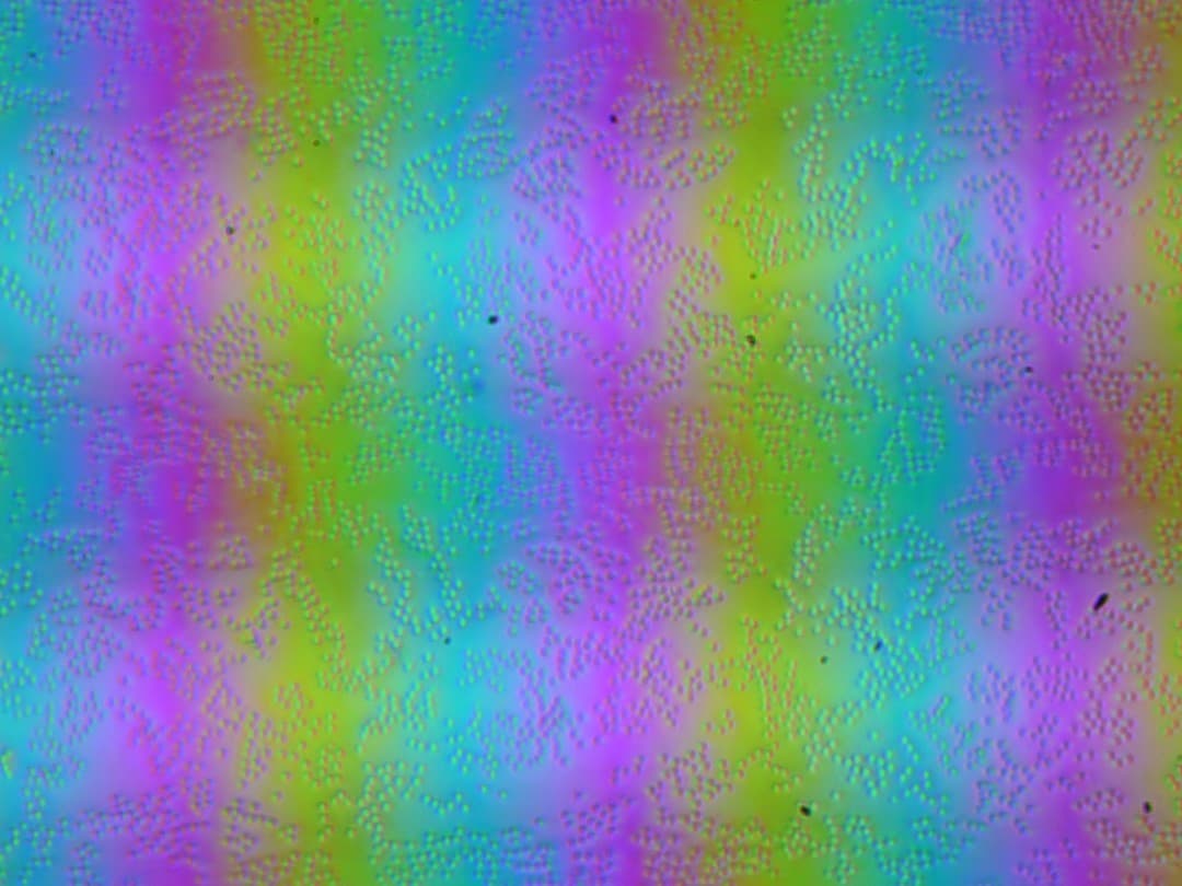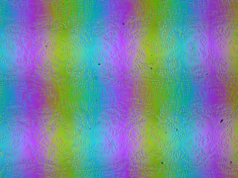 Зерно этих дефектов в несколько раз меньше размеров субпикселей (масштаб этих двух фотографий примерно одинаковый), поэтому фокусировка на микродефектах и «перескок» фокуса по субпикселям при изменении угла зрения выражены слабо, из-за этого нет и «кристаллического» эффекта.