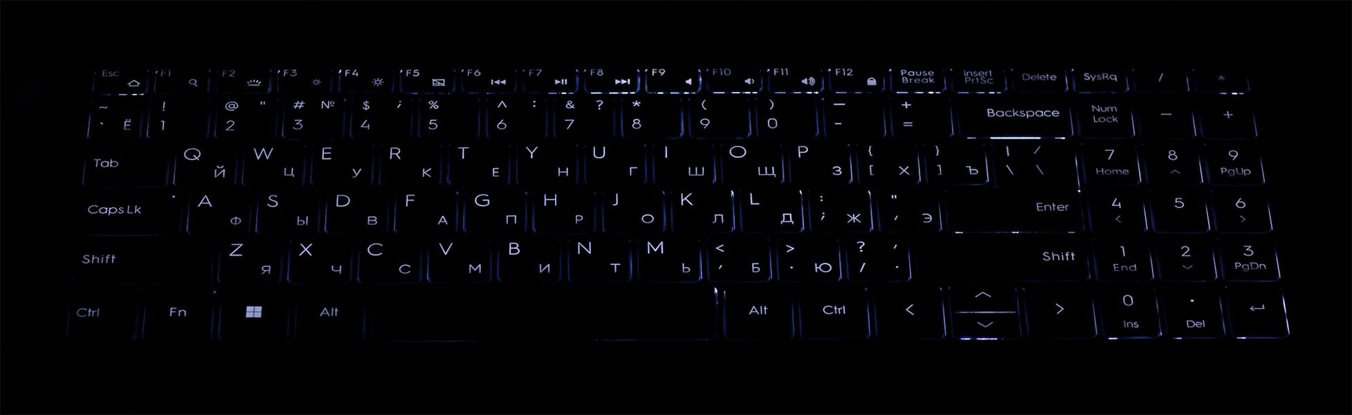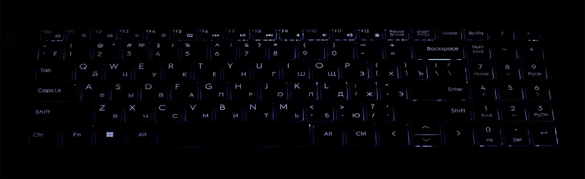 Клавиатура снабжена подсветкой с четырьмя уровнями по яркости (пятое состояние — выключена). Иллюминированы символы на клавишах и немного — их контуры. Распределение света позволяет в равной мере легко различать в темноте символы и латинской, и национальной раскладки (в нашем случае — кириллицы).