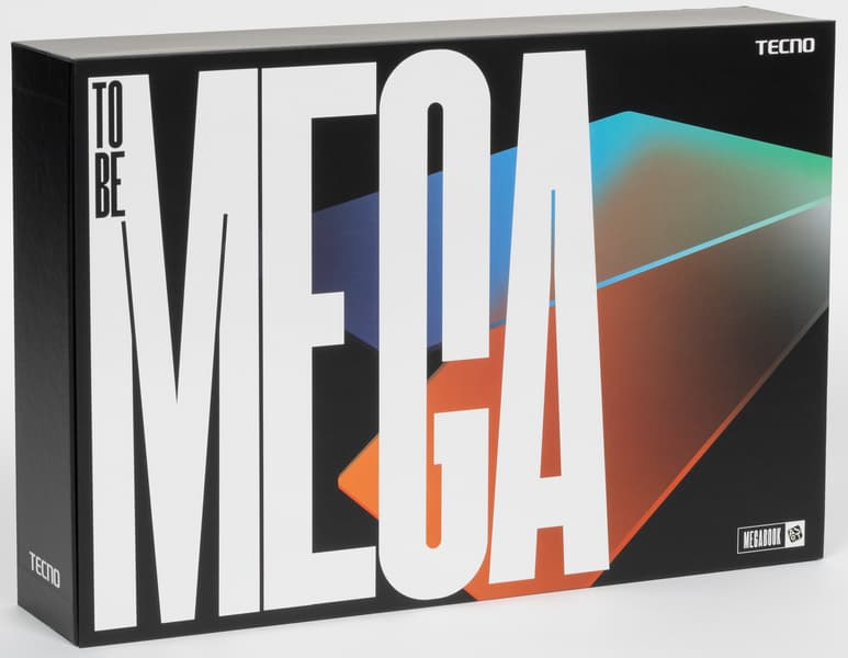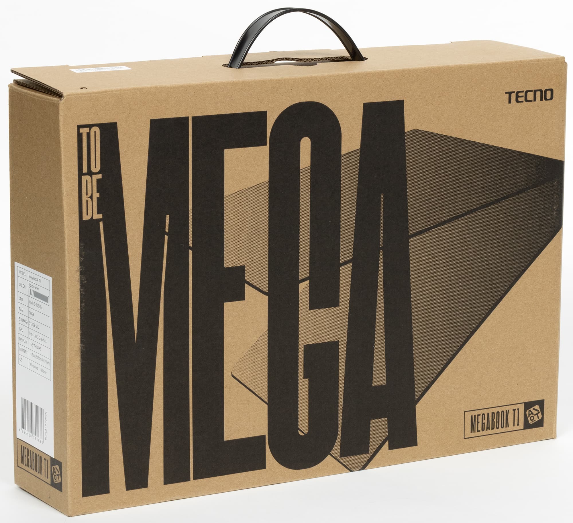 Транспортировочная коробка изготовлена из утилизированного сырья с монохромной (черной) типографской печатью. Она декорирована полусхематичным изображением ноутбука, названием модели, логотипом производителя и лозунгом To Be Mega. На самом верху коробки (если поставить ее вертикально) видна полезная деталь — вставная пластмассовая ручка для переноски.
