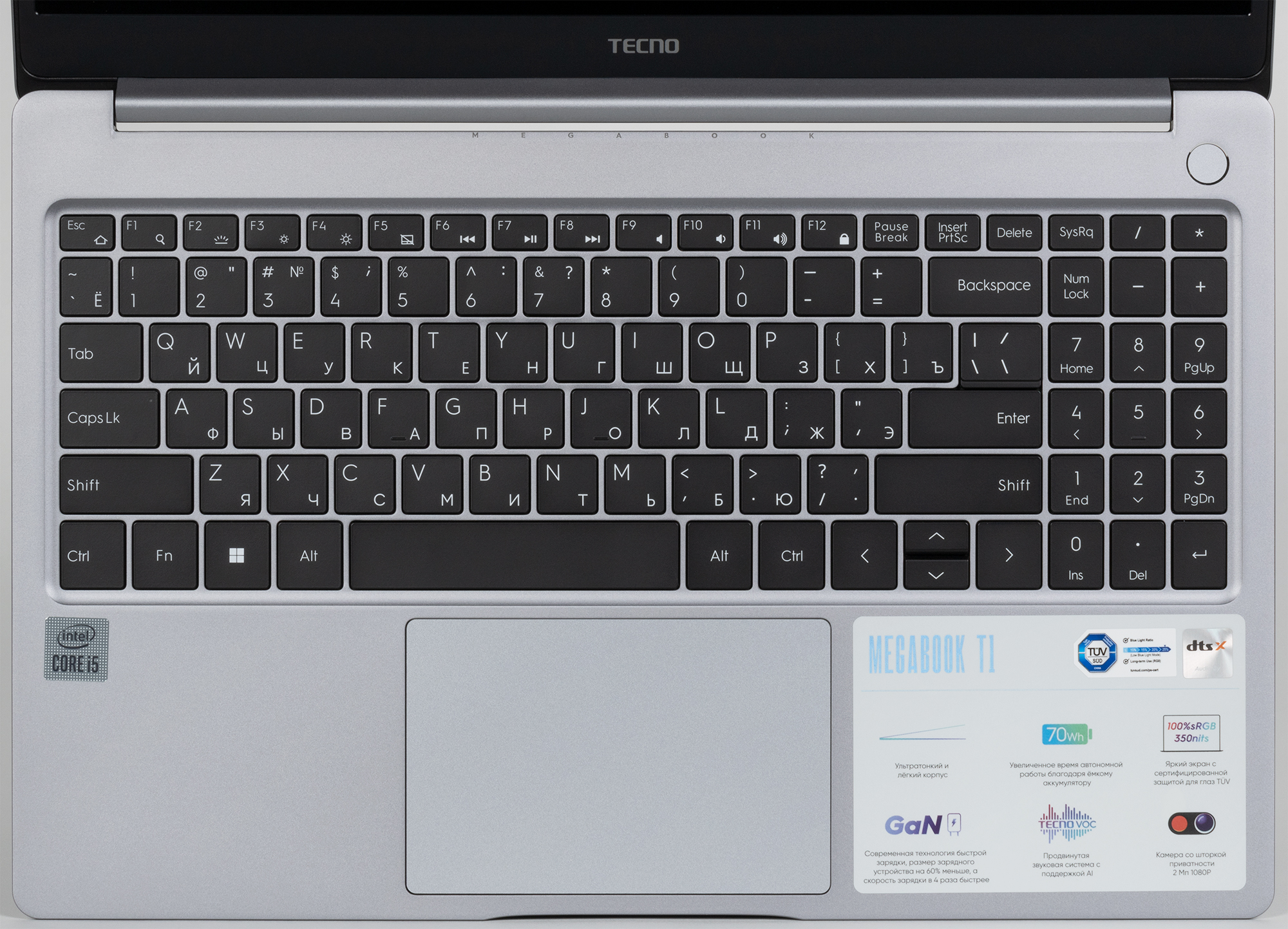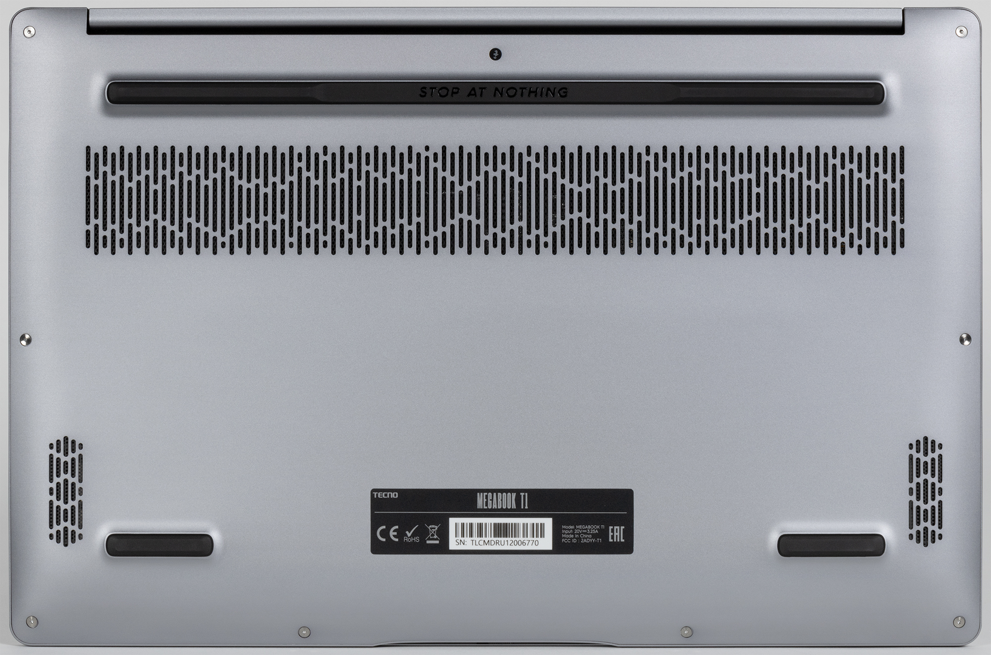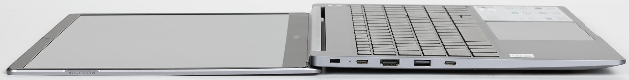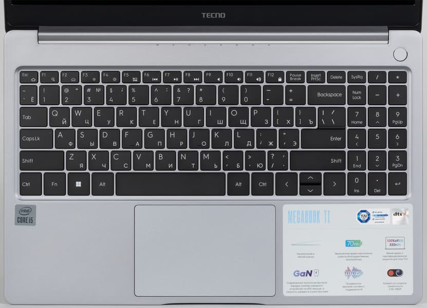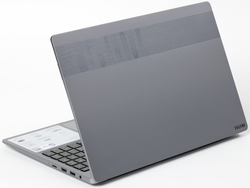 Tecno Megabook T1 обладает металлическим корпусом, изготовленным из сплава алюминия и магния (известного ранее как дюраль). Это очень разумное и эффективное решение, к тому же позволяющее придать устройству привлекательную внешность при соблюдении требований к прочности и надежности наружной оболочки. Дизайн крышки акцентирует внимание на названии серии Megabook, но, на наш взгляд, активнее, чем хотелось бы. Однако если не придираться, то в целом внешний вид достаточно спокойный и приятный взору.