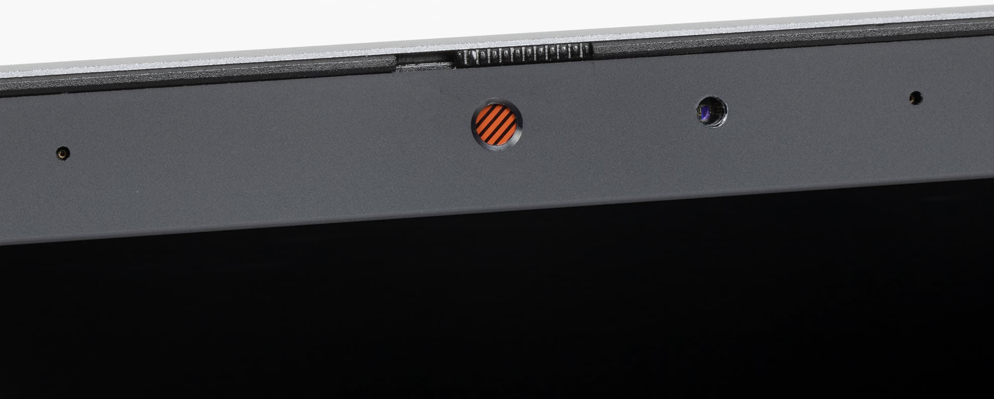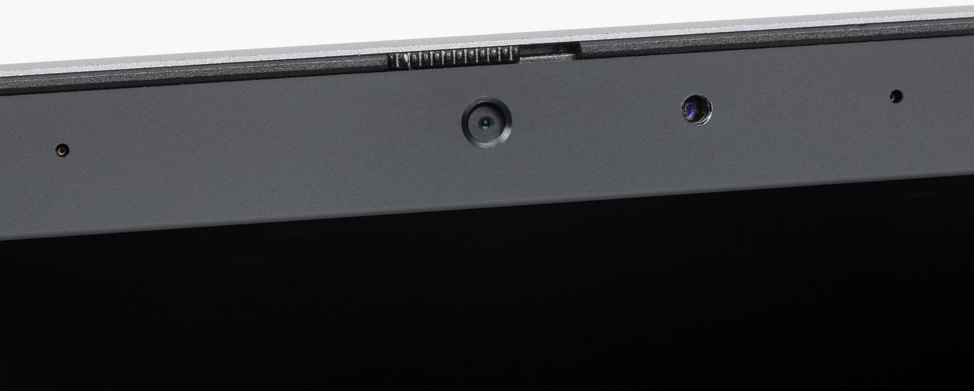 Упомянутая веб-камера снабжена механической шторкой, позволяющей избежать подглядывания за пользователем, а справа и слева от нее расположены отверстия микрофонов.
