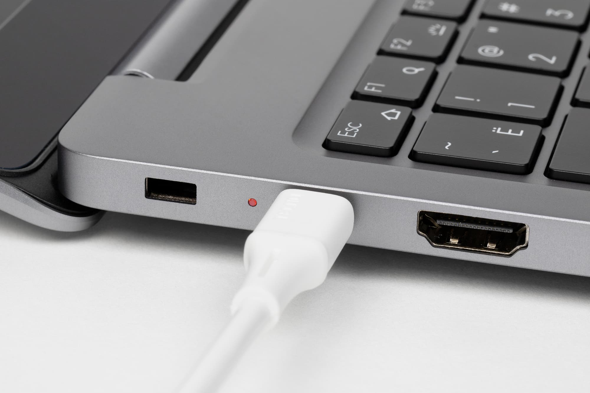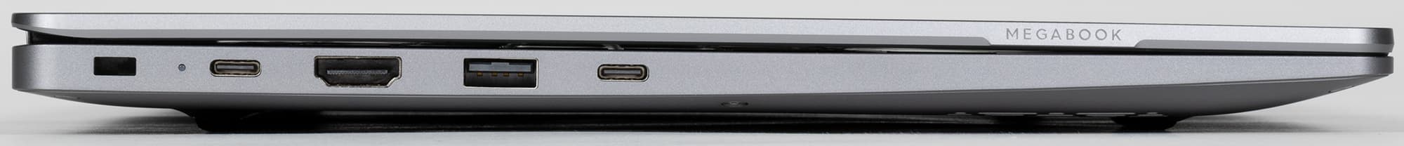 На левой боковой панели помещено отверстие кенсингтонского замка, индикатор заряда батареи, разъем USB3 Type С, предназначенный для подключения адаптера питания, но работающий и как стандартный интерфейсный порт, видеовыход HDMI, порты USB3 Type A и USB3 Type С (последний — с поддержкой вывода видео и быстрой зарядки для мобильных устройств).