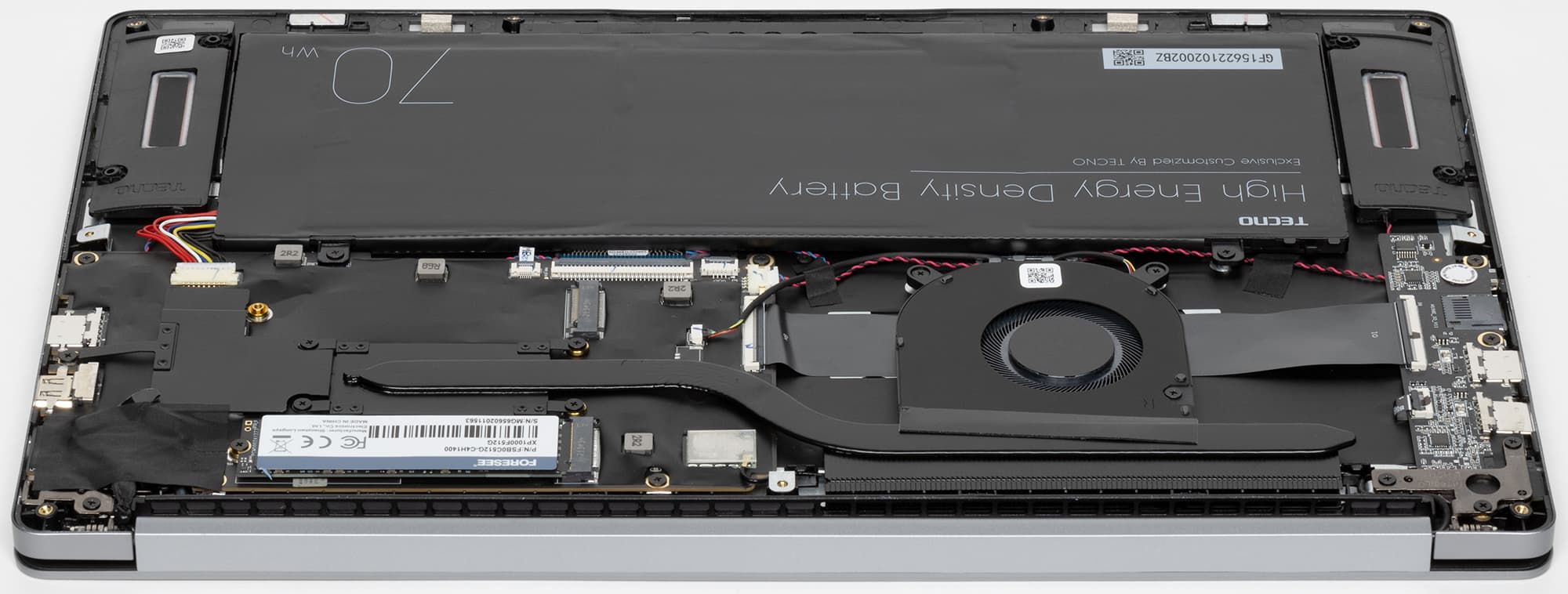 Для демонтажа нижней крышки придется вооружиться микроотверткой с мало распространенным причудливым звездчато-шестигранным шлицем. После этого открывается вид на систему охлаждения, твердотельный накопитель, аккумулятор. Оперативная память распаяна на плате, и с этим ничего не поделаешь, но возможна замена системного накопителя и установка дополнительного SSD во второй свободный слот M.2. Батарея крепится к корпусу винтами и подключается к собственному разъему, извлекается и устанавливается достаточно просто и быстро.
