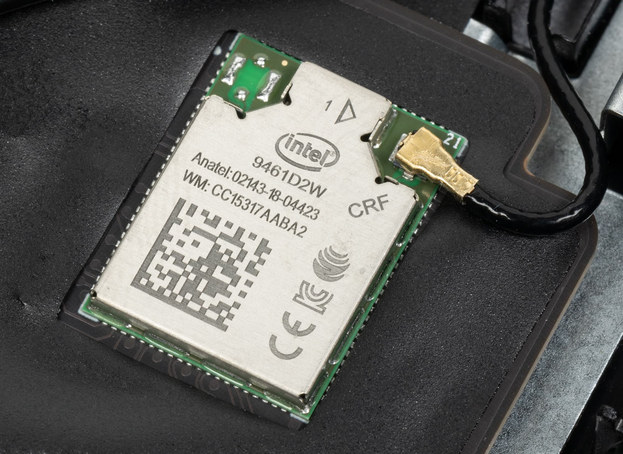 С правой стороны ближе к креплению крышки установлен адаптер беспроводной связи Intel Wireless AC9461 с поддержкой стандарта 802.11aс (класс Wi-Fi 5). Он располагает одной антенной, работающей одновременно на прием и передачу (1T1X).