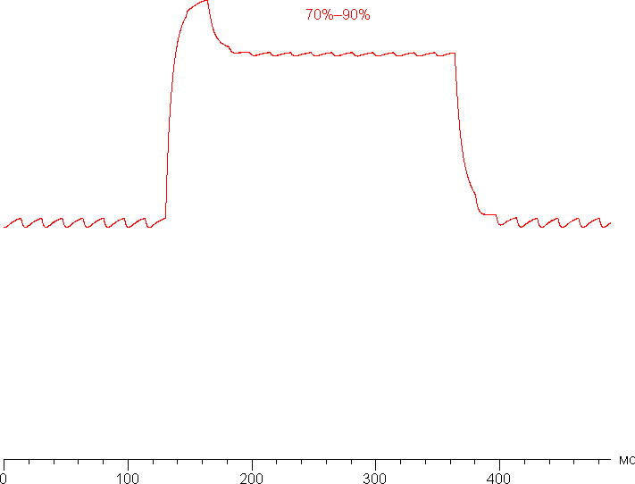 Время отклика при переходе черный-белый-черный равно 26 мс (15 мс вкл. + 11 мс выкл.), переход между полутонами серого в сумме (от оттенка к оттенку и обратно) в среднем занимает 27 мс. Матрица небыстрая, но у нее есть небольшой разгон — на фронтах некоторых переходов есть характерные выбросы яркости. Например, так выглядит график для переходов между оттенками 70% и 90%: