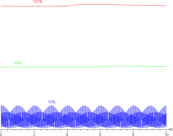 При сильном снижении яркости от максимума появляется модуляция подсветки, но ее частота очень высокая (25 кГц), поэтому никакого видимого глазом мерцания экрана нет, не выявляется оно и в тесте на стробоскопический эффект. Приведем графики зависимости яркости (вертикальная ось) от времени (горизонтальная ось) при различных значениях настройки яркости: