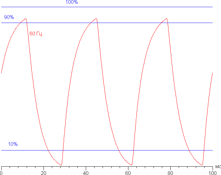 Посмотрим, хватит ли такой скорости матрицы для вывода изображения с частотой хотя бы 60 Гц. Приведем зависимость яркости от времени при чередовании белого и черного кадра при кадровой частоте 60 Гц: