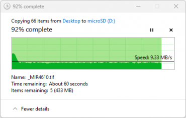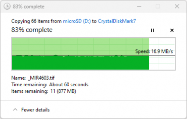 В реальной жизни важнее приведенные ниже скорости файловых операций, выполняемых средствами операционной системы. Мы проводили их в два раунда: путем копирования 64 файлов цифровых фотографий в TIFF и JPEG (общий объем 5,35 ГБ) с microSD на рабочий стол ноутбука и затем наоборот, с рабочего стола на носитель.