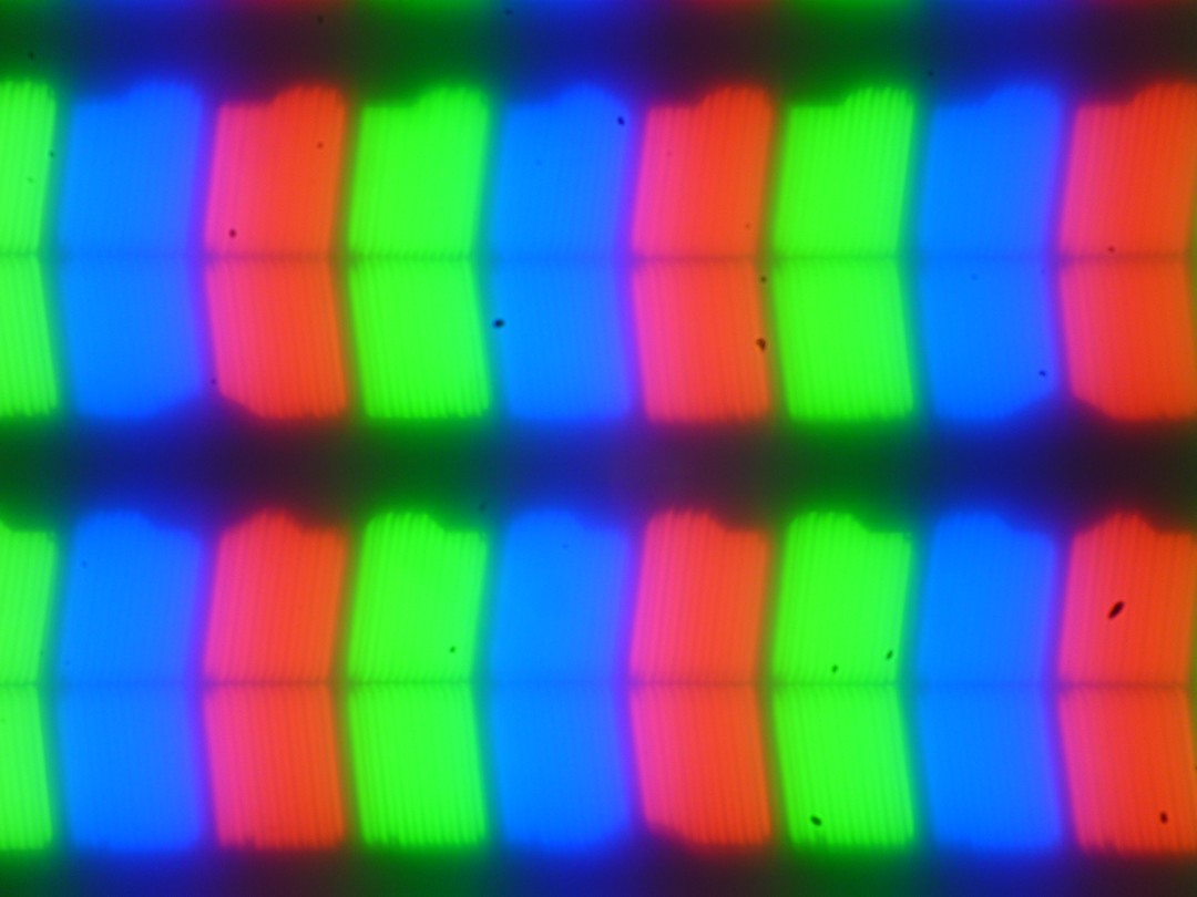 В этом ноутбуке используется матрица типа IPS. Микрофотографии демонстрируют типичную для нее структуру субпикселей (черные точки — это пыль на сенсоре фотоаппарата):