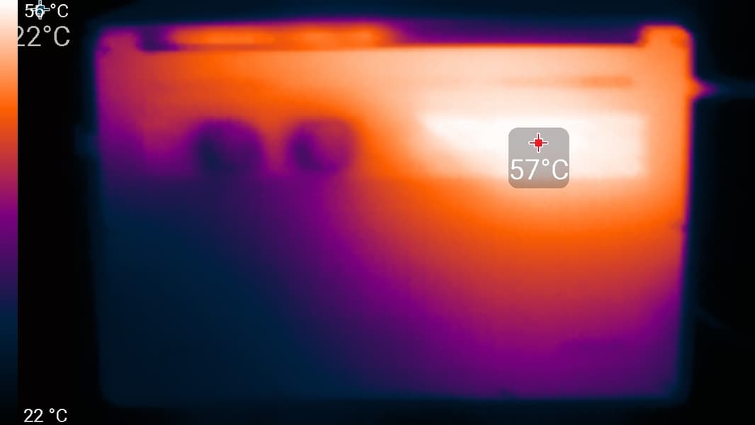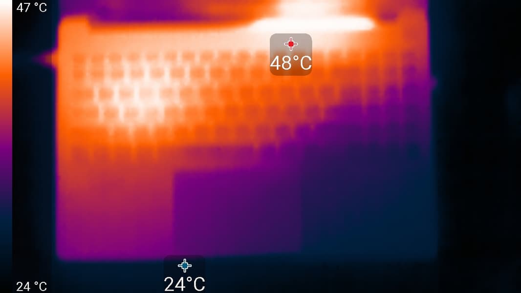 На заднем торце корпуса есть более крупные прорези, через которые система вентиляции выбрасывает нагретый воздух (от глаз они скрыты изгибом, закрывающим петли). Получается подогрев нижней части экрана, но во время запуска «тяжелых» тестов выяснилось: не особо ощутимый.