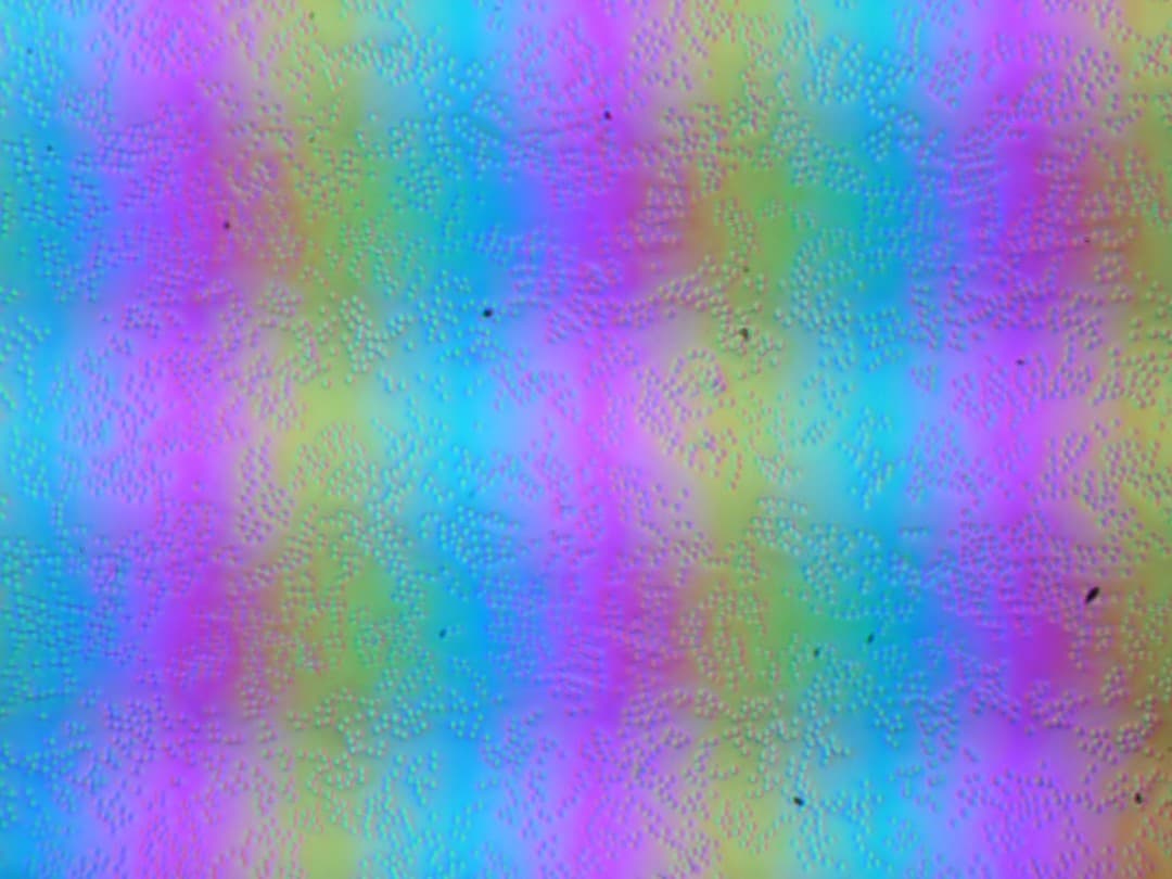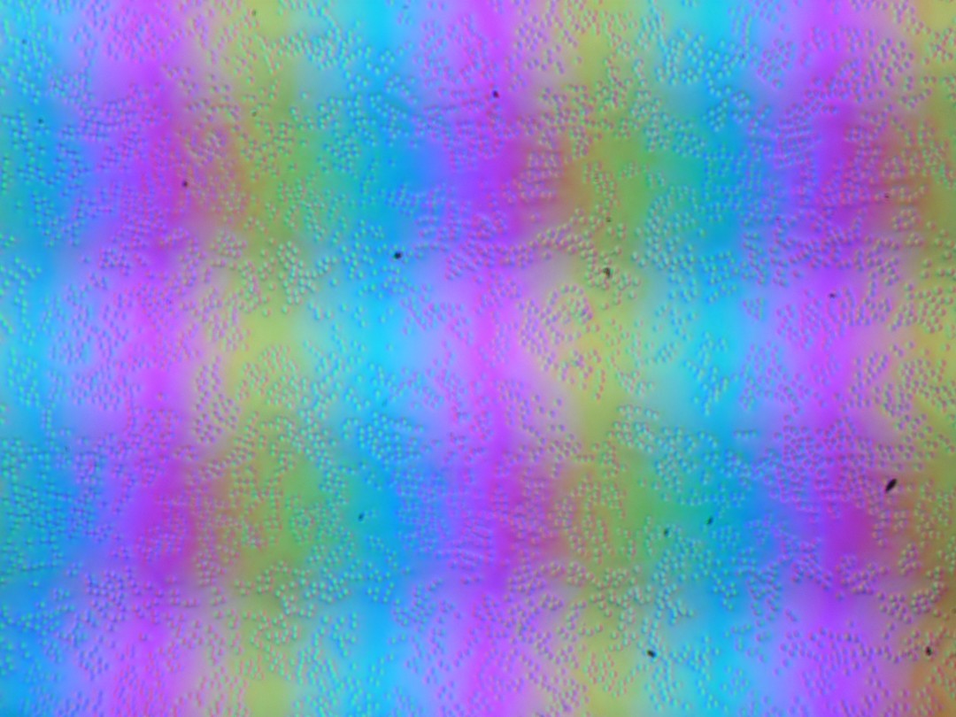 Зерно этих дефектов в несколько раз меньше размеров субпикселей (масштаб этих двух фотографий примерно одинаковый), поэтому фокусировка на микродефектах и «перескок» фокуса по субпикселям при изменении угла зрения выражены слабо, из-за этого нет и «кристаллического» эффекта.