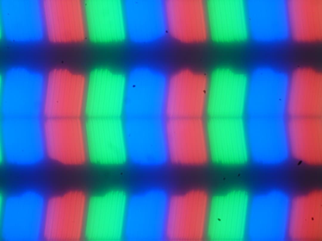 В этом ноутбуке используется матрица типа IPS. Микрофотографии демонстрируют типичную для IPS структуру субпикселей (черные точки — это пыль на матрице фотоаппарата):