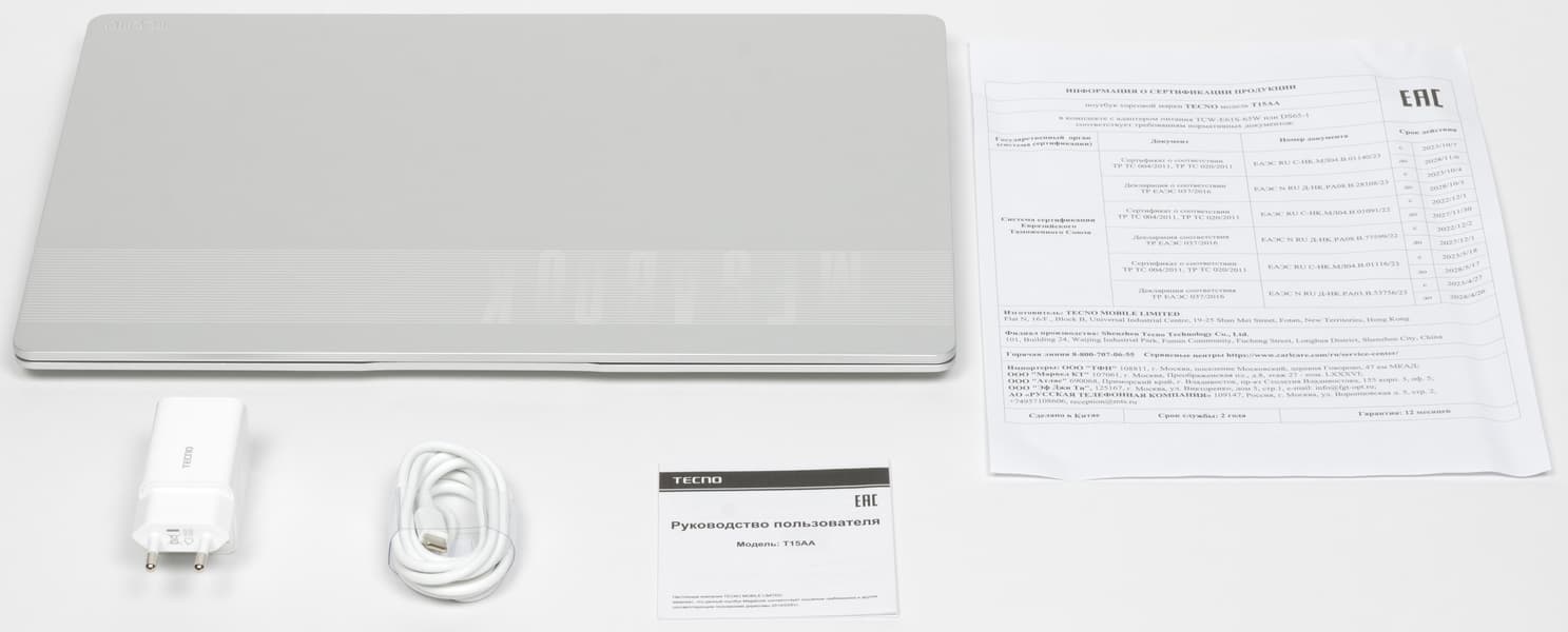 В комплекте, кроме самого ноутбука, есть адаптер питания со сменным выходным кабелем длиной 1,75 м, книжечка-инструкция на русском языке (шрифт мог бы быть и покрупнее, но приоритетом явно была экономия бумаги), а также лист с гораздо лучше читаемой информацией о сертификации.