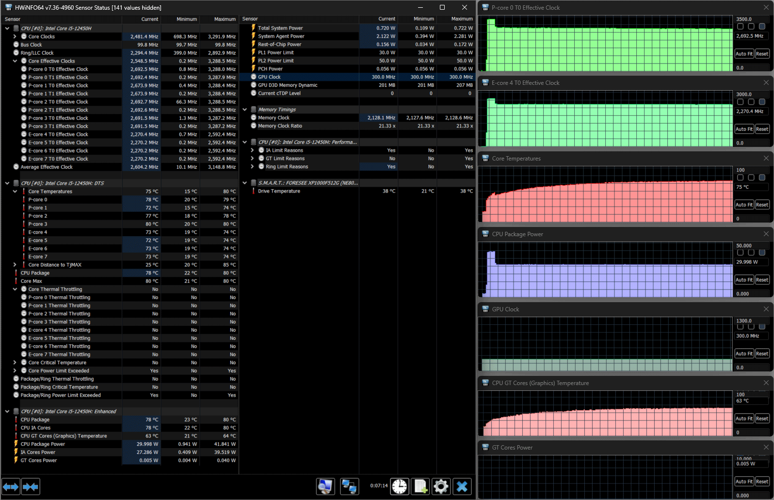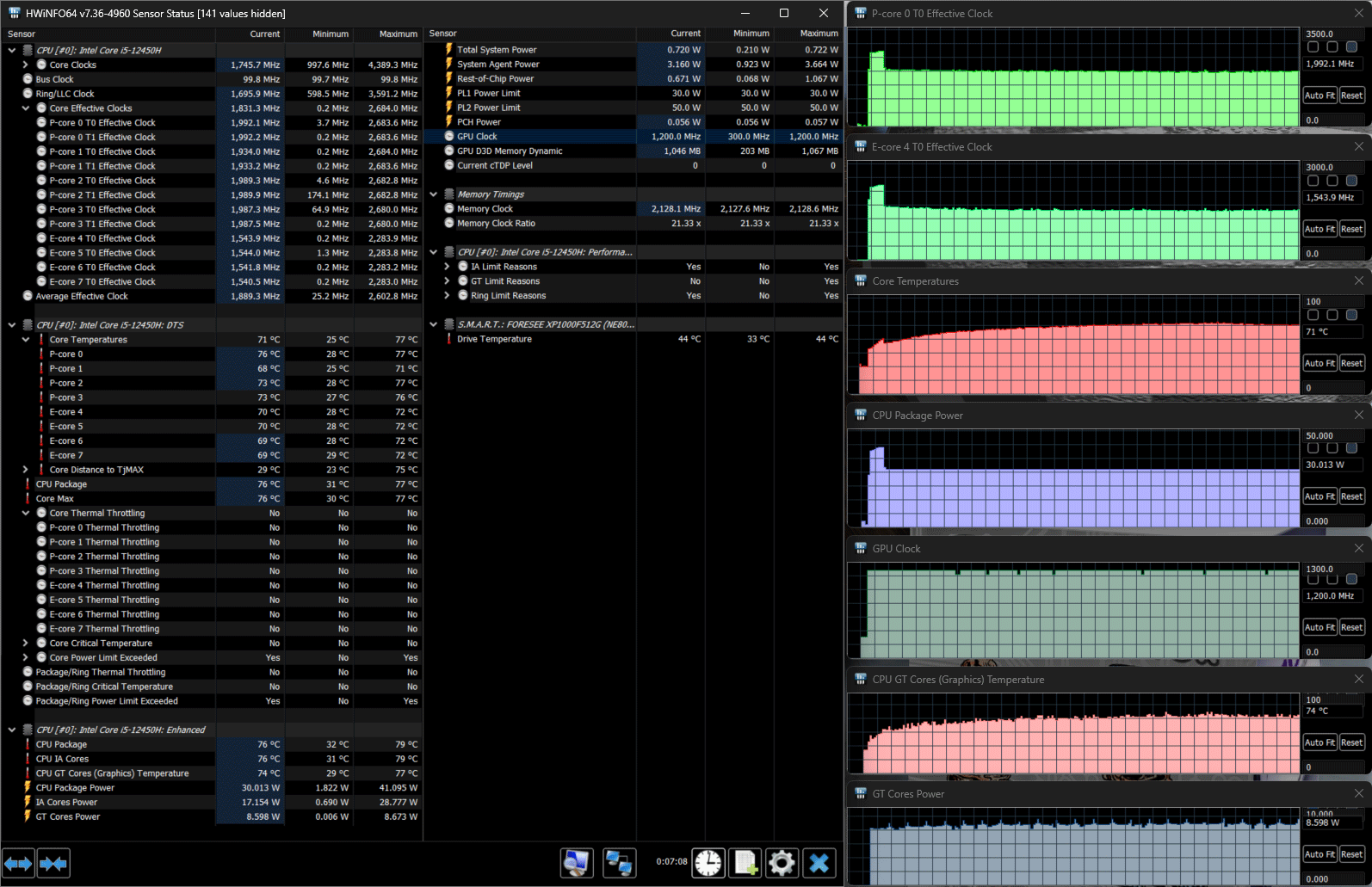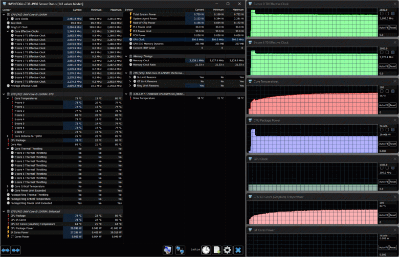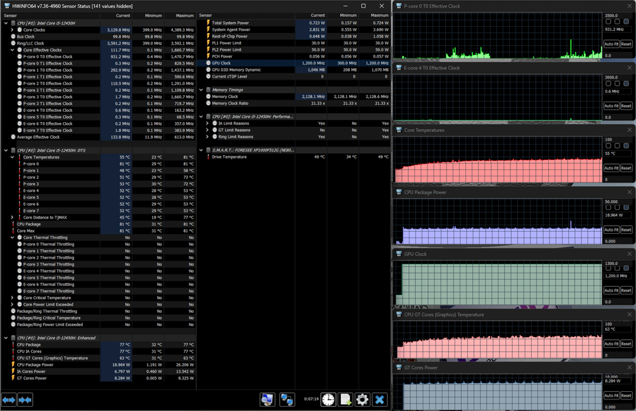 В ноутбуке установлен процессор 12-го поколения Intel Core i5-12450H (4+4 ядра/12 потоков, до 3,3/4,4 ГГц, TDP 35-45 Вт / Boost до 95 Вт, кодовое наименование Alder Lake, выпускается с начала 2022 года). У него 8 ядер, из них четыре Performance cores (P-cores, производительные), которые могут работать в два потока на частотах до 4,4 ГГц, и столько же однопоточных энергоэффективных Efficient cores (E-cores, до 3,3 ГГц), максимальное количество потоков будет двенадцать. В нашем случае в предшествующих тестах длительное потребление достигало лишь 30 Вт, а пиковые значения не превышали 42 Вт, то есть процессор заметно «придушен».