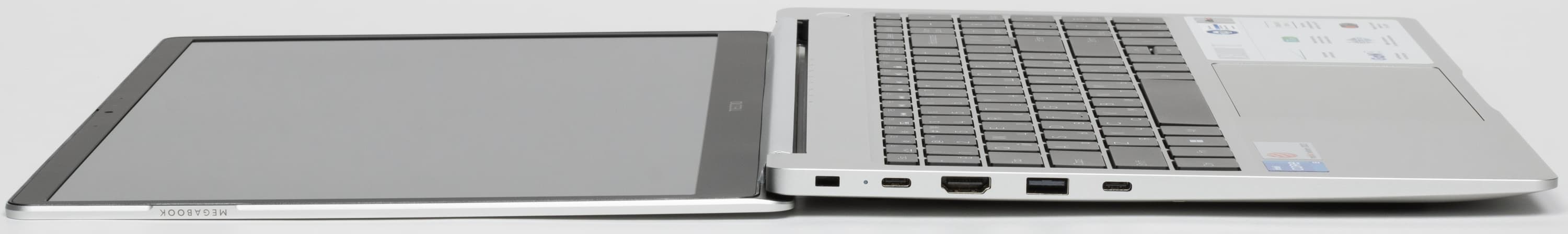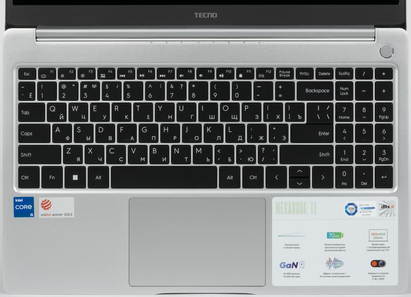 Дизайн общий для ноутбуков Tecno Megabook T: выглядят эти модели вполне элегантно, хотя впечатление несколько портится при открытой крышке из-за обилия разноцветных наклеек, которые хоть и свидетельствуют наглядно о некоторых достоинствах аппаратов, но с эстетической точки зрения выигрышным решением точно не являются.