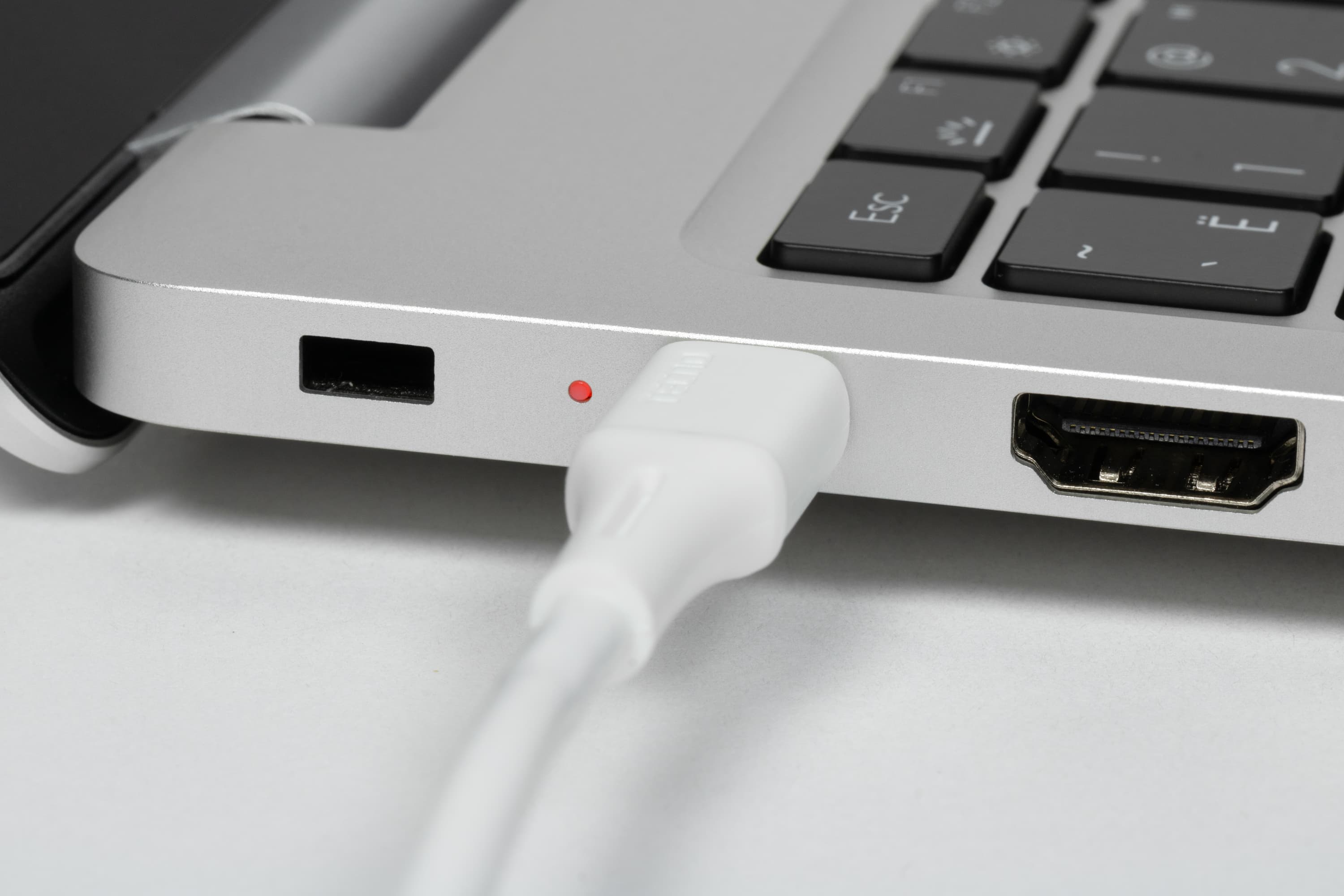На левом боку имеются отверстие кенсингтонского замка, двухцветный светодиодный индикатор (белый+оранжевый), разъем USB Type-C для подключения адаптера питания (и только для этого — передача данных не поддерживается!), полноразмерный порт HDMI, порты USB 3.1 Type-A и еще один USB Type-C, на этот раз полнофункциональный.