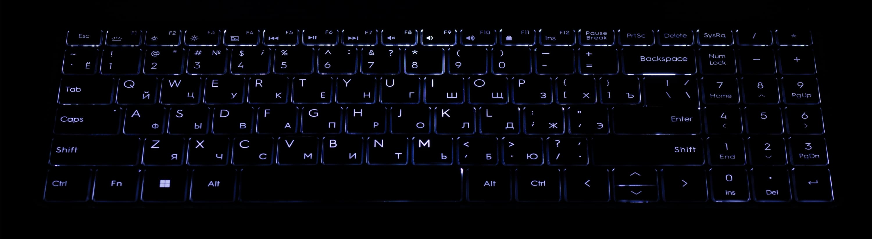 Предусмотрена подсветка — белая, с четырьмя уровнями, на минимуме едва заметная, а на максимуме яркость достаточная. Подсветка управляется сочетанием клавиш, но автоматически отключается при неиспользовании клавиатуры в течение 15 секунд — не самая удобная «фича», но воздействовать на нее нельзя. Подсвечиваются и нанесенные символы, и края клавиш (но в меньшей степени).