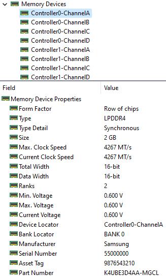 На системной плате распаяны чипы памяти LPDDR4-4266 производства Samsung. Утилиты рапортуют о четырехканальном режиме, но по пропускной способности это равнозначно двухканальному у более старых типов памяти вроде DDR4.