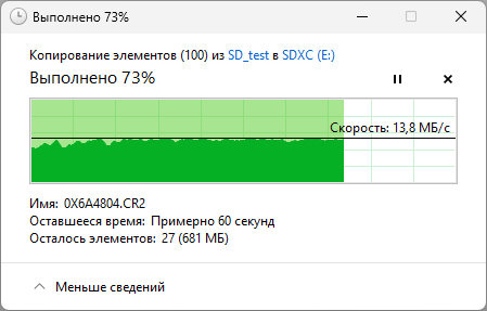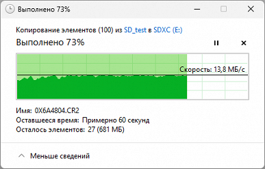 Второй тест — скорость реальных файловых операций, выполняемых средствами ОС: копирование 100 файлов изображений общим объемом 2,5 ГБ сначала с носителя в папку на рабочем столе, затем из папки на носитель.