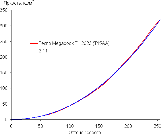 Аппроксимация полученной гамма-кривой дала показатель 2,11, что ниже стандартного значения 2,2, поэтому картинка чуть-чуть высветлена. При этом реальная гамма-кривая немного отклоняется от аппроксимирующей степенной функции: