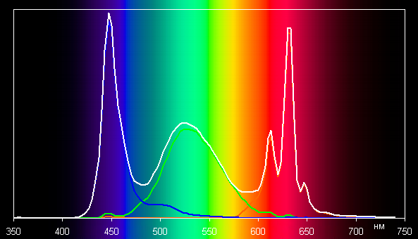 Ниже приведен спектр для белого поля (белая линия), наложенный на спектры красного, зеленого и синего полей (линии соответствующих цветов):