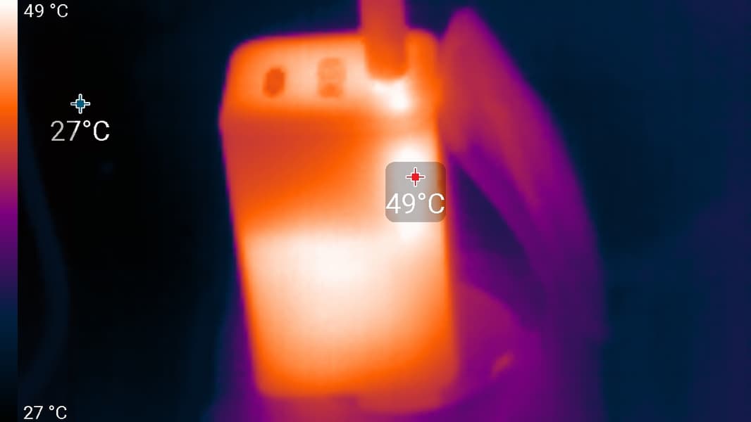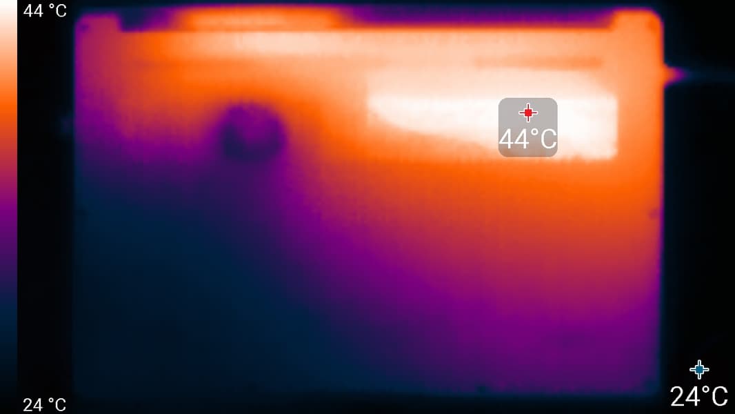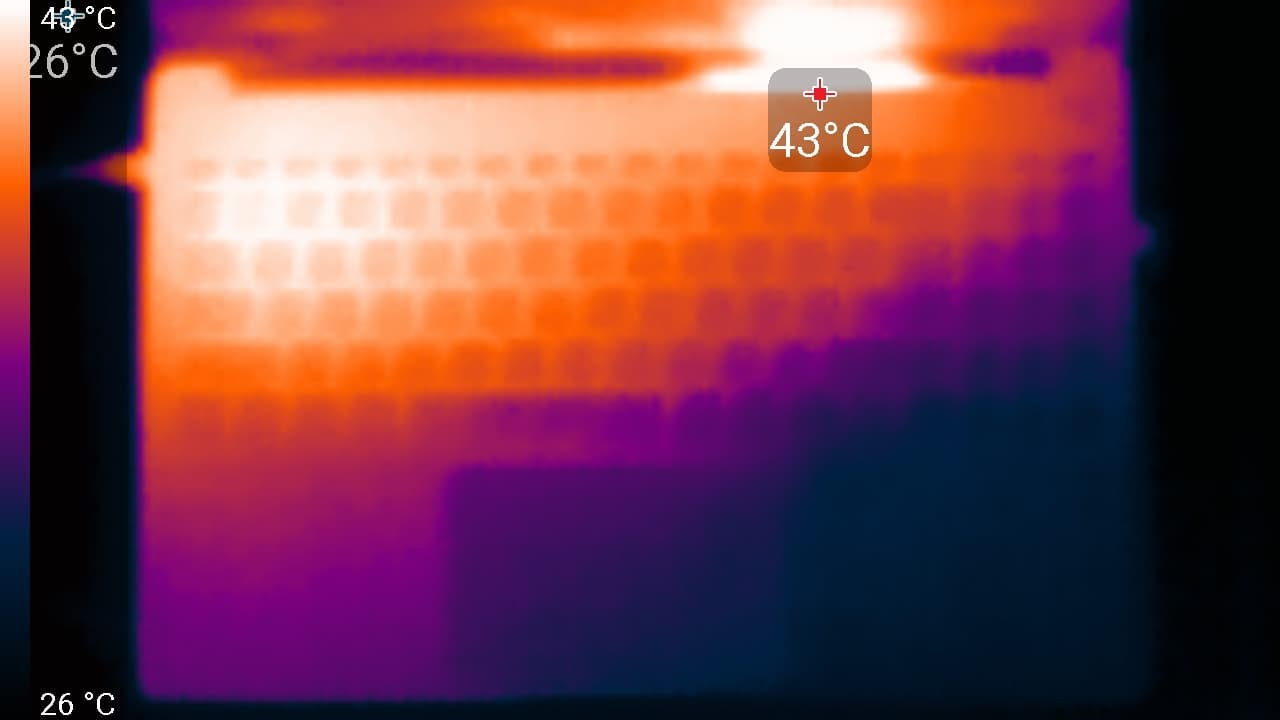 На заднем торце корпуса есть более крупные прорези, через которые система вентиляции выбрасывает нагретый воздух (от глаз они скрыты изгибом, закрывающим петли). Получается подогрев нижней части экрана, но во время запуска «тяжелых» тестов выяснилось: не особо ощутимый.