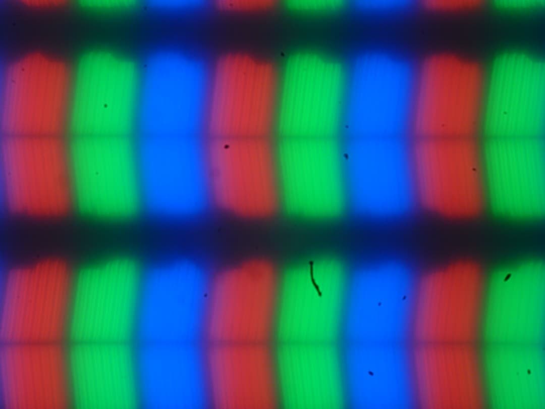 В этом ноутбуке используется матрица типа IPS. Микрофотографии демонстрируют типичную для IPS структуру субпикселей (черные точки — это пыль на матрице фотоаппарата):