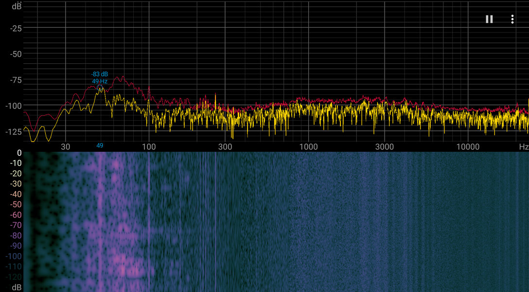 Если ноутбук не нагружать совсем, то его система охлаждения в указанных выше условиях может работать в пассивном режиме. Даже под большой нагрузкой шум от системы охлаждения невысокий. Характер шума ровный и раздражения не вызывает. Спектрограмма, полученная для варианта с максимальной нагрузкой на процессор, достаточно ровная и в диапазоне частот, где звуки особенно могут вызывать раздражение, выраженных пиков нет (низкочастотными пиками можно пренебречь):