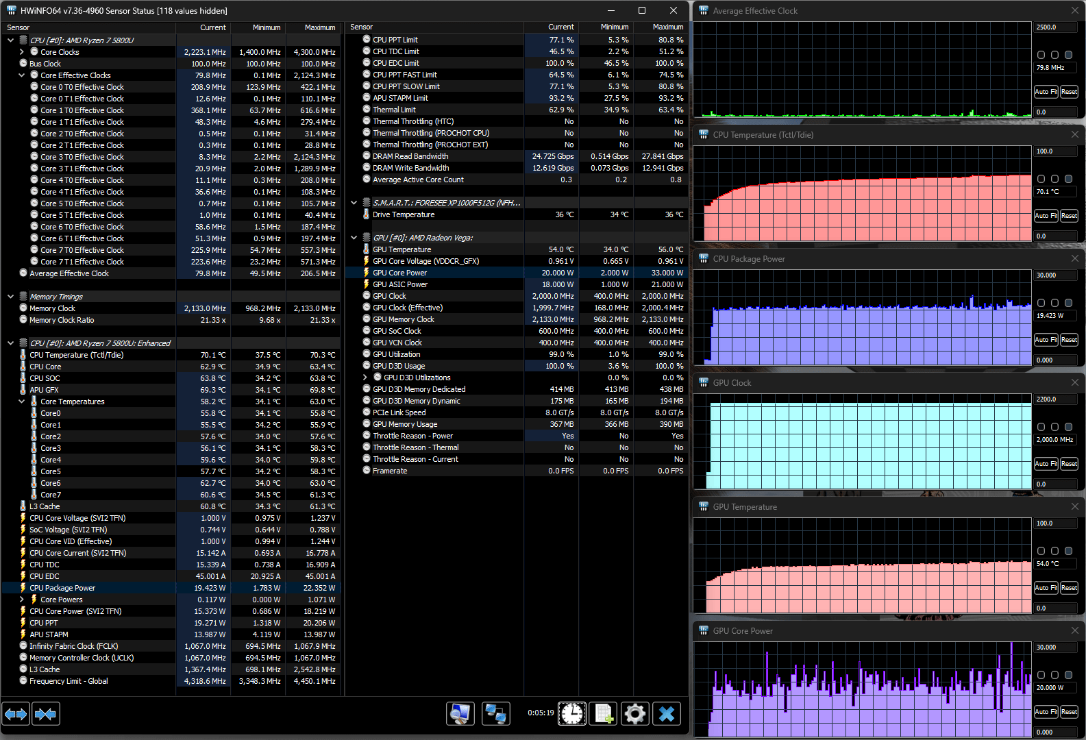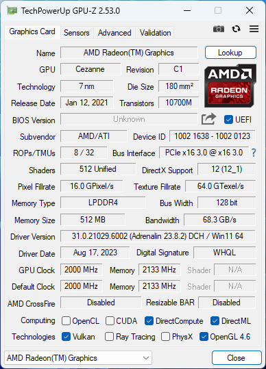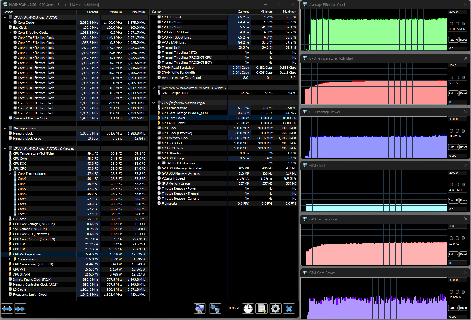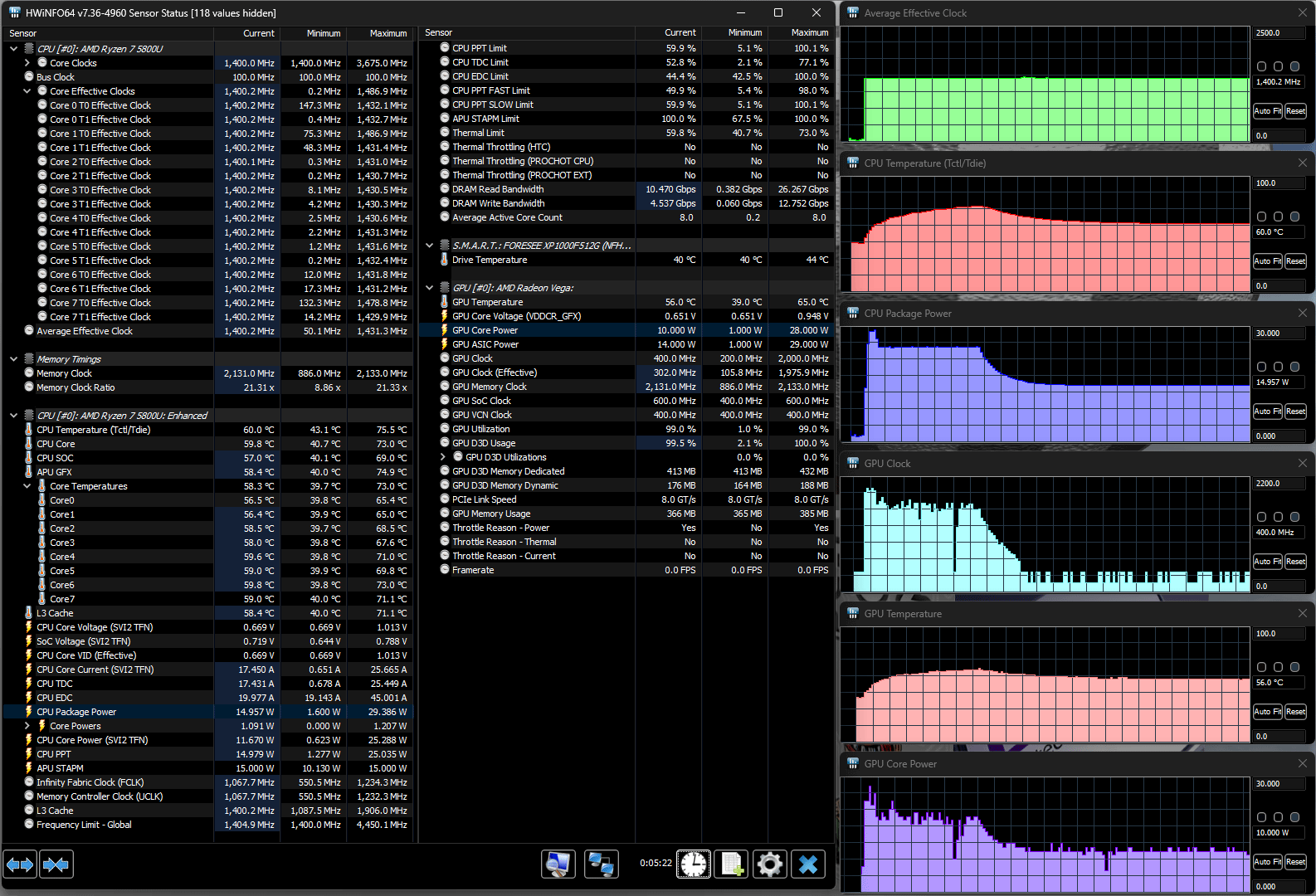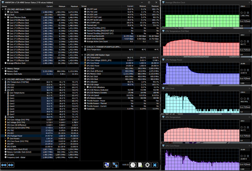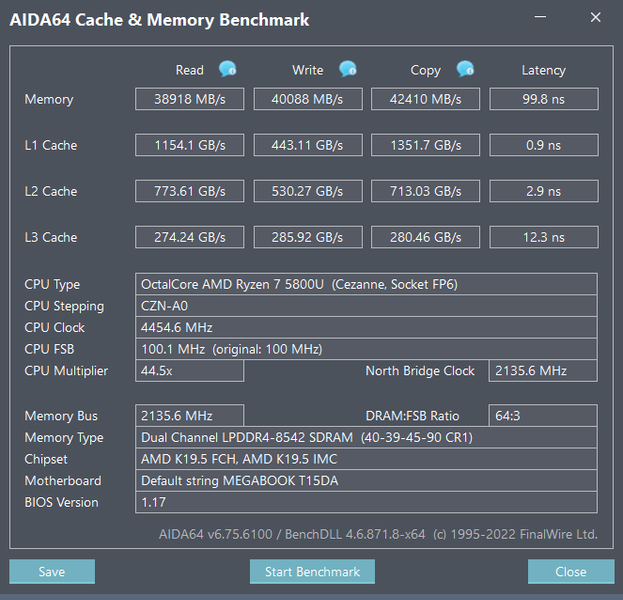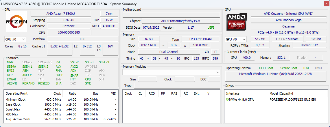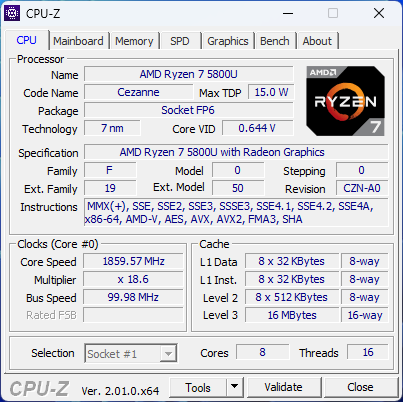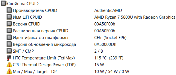 В ноутбуке установлен процессор AMD Ryzen 7 5800U с архитектурой Cezanne-U (Zen 3), который поставляется с начала 2021 года. У него 8 ядер, способных работать в 16 потоков, базовая частота 1,9 ГГц, теоретически технология Precision Boost позволяет разгонять часть ядер (но не все разом) до 4,4 ГГц, в нашем случае это не наблюдалось и близко.