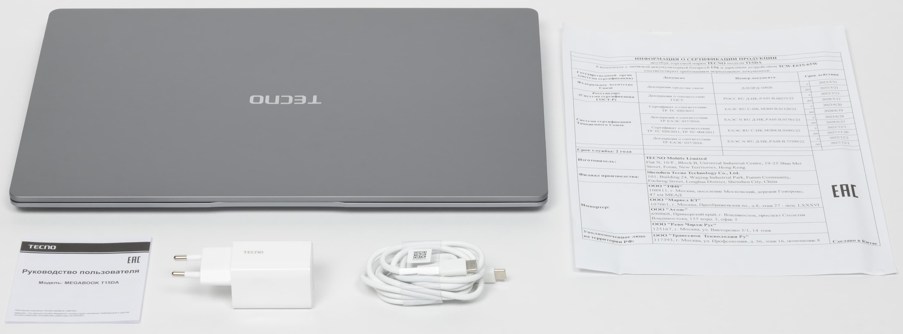 В комплекте, кроме самого ноутбука, есть адаптер питания со сменным выходным кабелем длиной 1,75 м, книжечка-инструкция на русском языке, а также лист с информацией о сертификации.