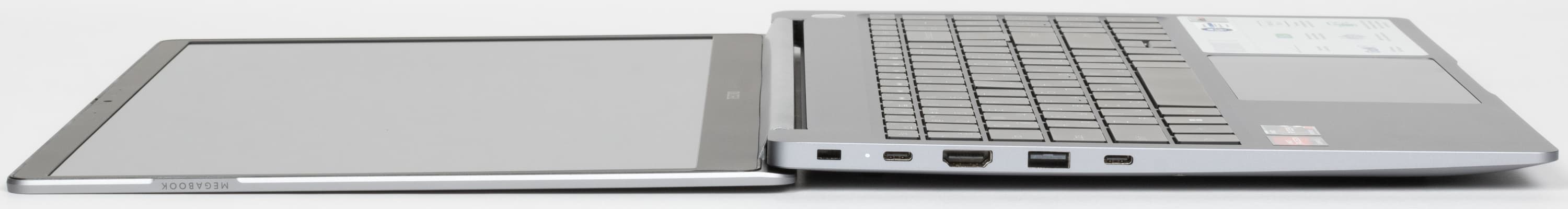 Дизайн общий для ноутбуков Tecno Megabook T: выглядят эти модели вполне элегантно, хотя впечатление несколько портится при открытой крышке из-за обилия разноцветных наклеек, которые хоть и свидетельствуют наглядно о некоторых достоинствах аппаратов, но с эстетической точки зрения выигрышным решением точно не являются.