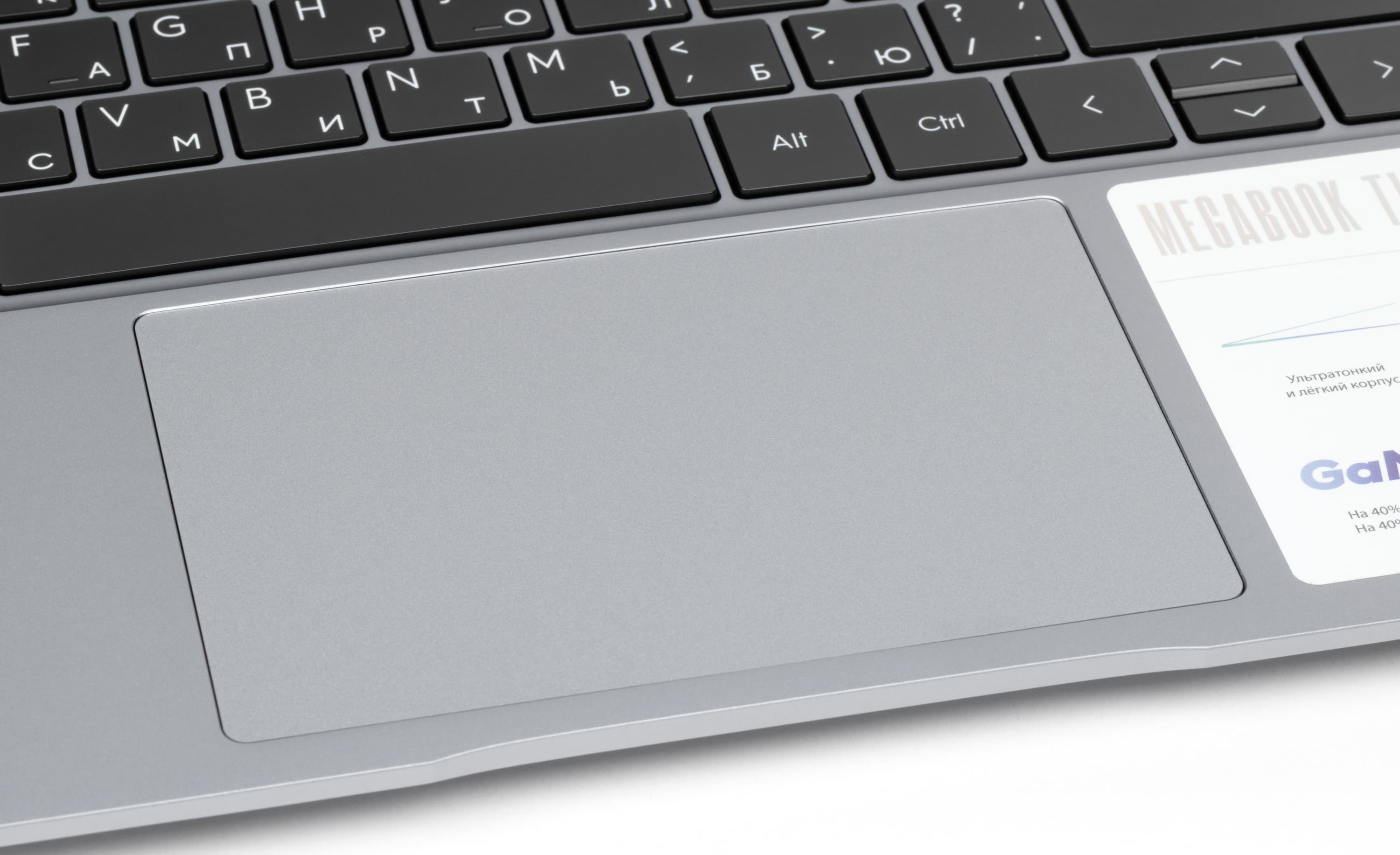 Клавиатура точно такая, как в уже знакомой нам модели Tecno Megabook T15AA — мембранного типа с островным расположением кнопок и трехрядным цифровым блоком. Клавиши со стрелками вверх и вниз имеют «половинную» высоту.