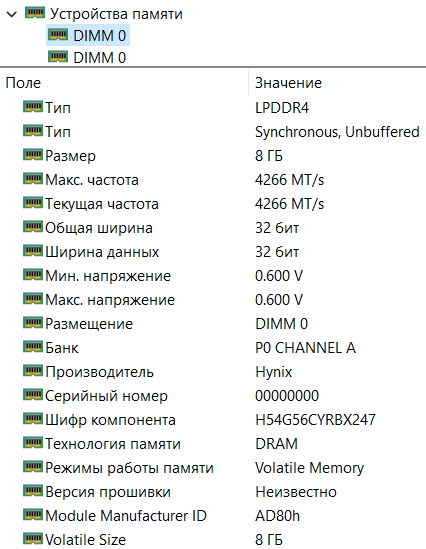 На системной плате распаяны чипы памяти LPDDR4-4266 производства SK Hynix, работающие в двухканальном режиме.