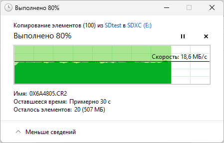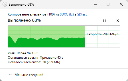 Второй тест — скорость реальных файловых операций, выполняемых средствами ОС: копирование 100 файлов изображений общим объемом 2,5 ГБ сначала с носителя в папку на рабочем столе, затем из папки на носитель.