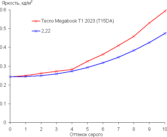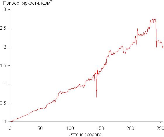 Рост прироста яркости на большей части шкалы серого более-менее равномерный, и каждый следующий оттенок ярче предыдущего. В самой темной области аппаратно и визуально различаются все оттенки: