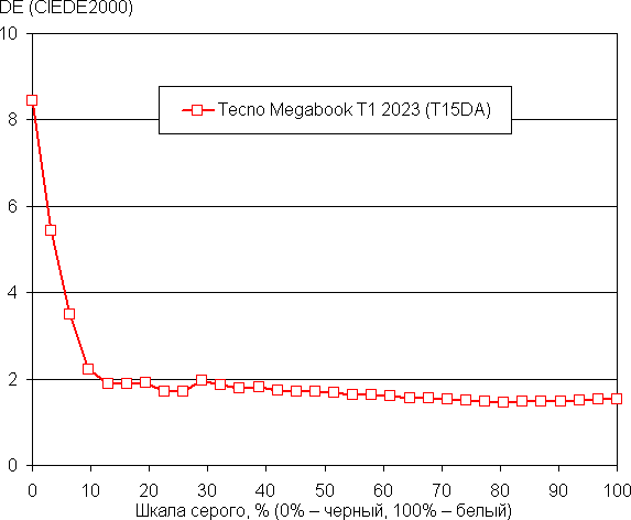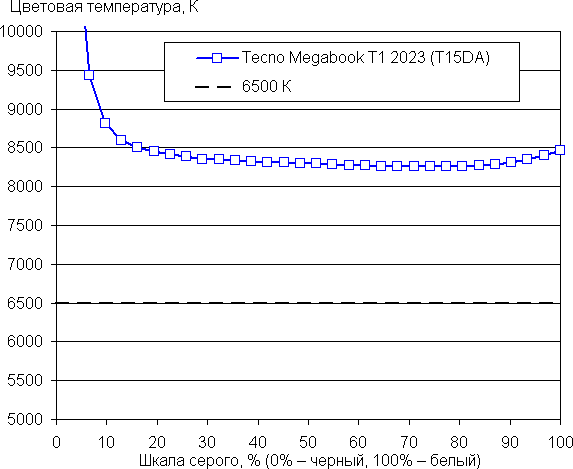 Баланс оттенков на шкале серого компромиссный, так как цветовая температура существенно выше стандартных 6500 К, но отклонение от спектра абсолютно черного тела (ΔE) ниже 2, что даже для профессионального устройства считается отличным показателем. При этом цветовая температура и ΔE мало изменяются от оттенка к оттенку — это положительно сказывается на визуальной оценке цветового баланса. (Самые темные области шкалы серого можно не учитывать, так как там баланс цветов не имеет большого значения, да и погрешность измерений цветовых характеристик на низкой яркости большая.)