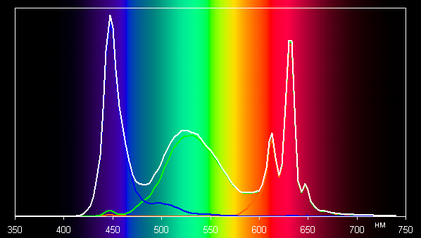 Ниже приведен спектр для белого поля (белая линия), наложенный на спектры красного, зеленого и синего полей (линии соответствующих цветов):