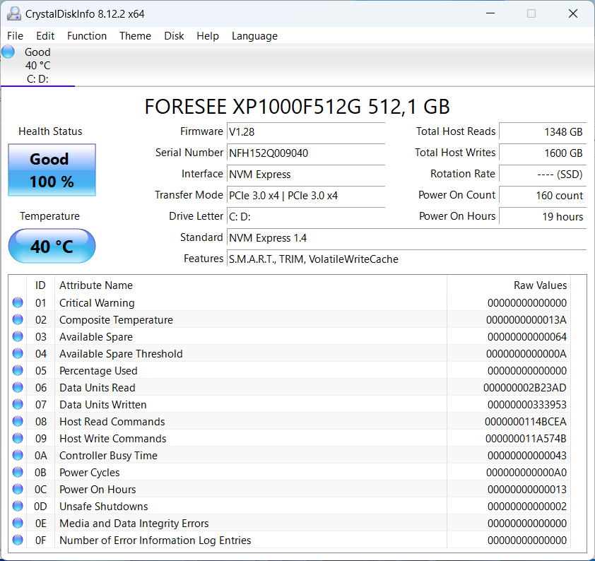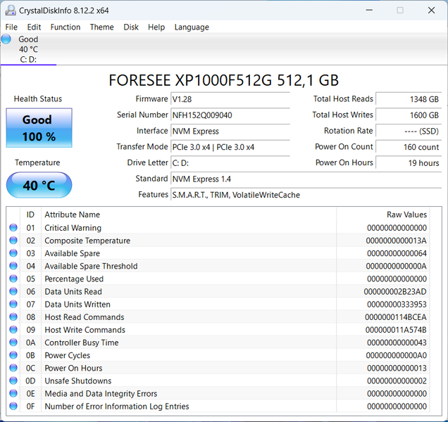 Установлен накопитель Foresee XP1000F512G (512 ГБ, M.2 2280, NVMe, PCIe 3.0 x4):