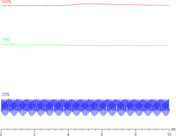 При сильном снижении яркости от максимальной появляется модуляция подсветки, но ее частота очень высокая (25 кГц), поэтому никакого видимого глазом мерцания экрана нет, не выявляется оно и в тесте на стробоскопический эффект. Приведем графики зависимости яркости (вертикальная ось) от времени (горизонтальная ось) при различных значениях настройки яркости: