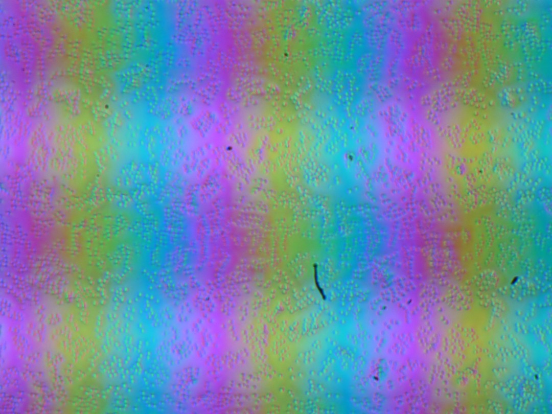 Зерно этих дефектов в несколько раз меньше размеров субпикселей (масштаб этих двух фотографий примерно одинаковый), поэтому фокусировка на микродефектах и «перескок» фокуса по субпикселям при изменении угла зрения выражены слабо, из-за этого нет и «кристаллического» эффекта.