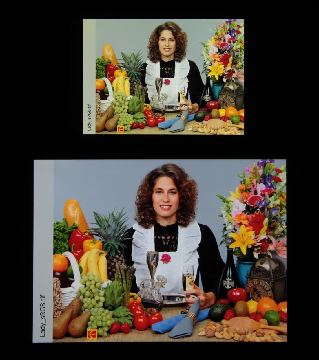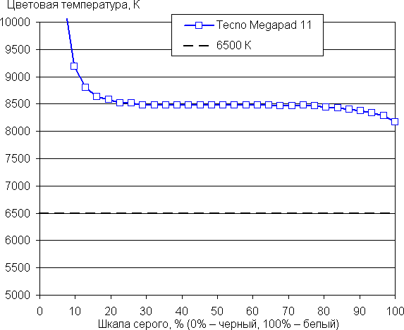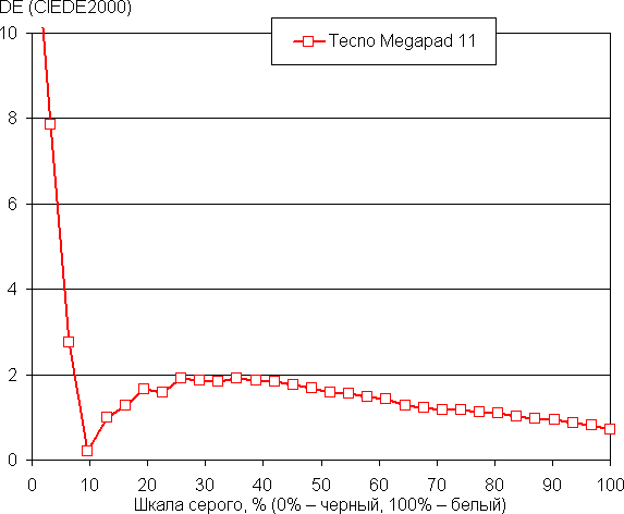 Баланс оттенков на шкале серого средний, так как цветовая температура существенно выше стандартных 6500 К, но отклонение от спектра абсолютно черного тела (ΔE) ниже 3 единиц, что даже для профессионального устройства считается хорошим показателем. При этом цветовая температура и ΔE мало изменяются от оттенка к оттенку — это положительно сказывается на визуальной оценке цветового баланса. (Самые темные области шкалы серого можно не учитывать, так как там баланс цветов не имеет большого значения, да и погрешность измерений цветовых характеристик на низкой яркости большая.)